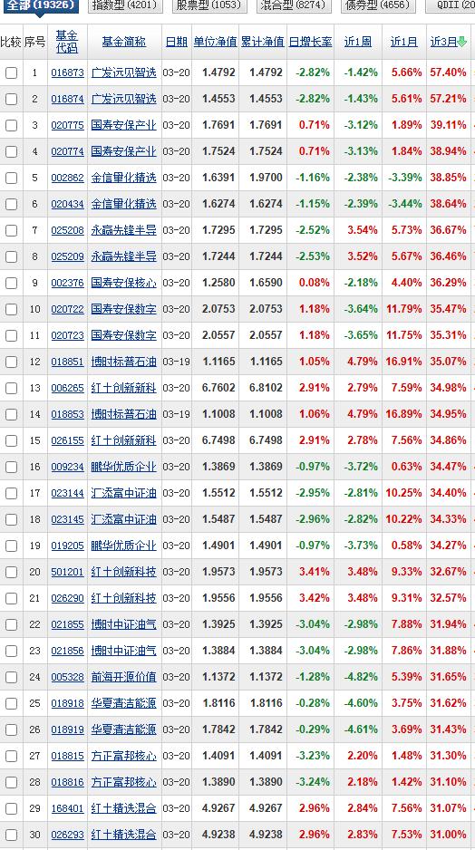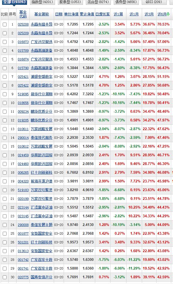本周各时段收益榜单已经新鲜出炉。今年以来和近3个月榜单时间高度重合,所以大体是相当的。由于有色金属暴跌超20%,之前长期霸榜前三的西部利得三兄弟早已沦落到三千名开外。 今年以来和近3个月以来的第一名都是广发远见智选,而且领先优势很大。领先第二名最少有14%以上。广发远见今年以来收益率49.22%,第二名国寿安保数字经济34.80%,第三名博时标普石油34.10%,第四名国寿安保产业31.98%,第五名红土创新新科技股票31.14%。 近3个月广发远见57.40%高居第一,国寿安保产业39.11%排名第二,金信量化精选38.85%排名第三,永赢先锋半导体36.67%排名第四,国寿安保核心和国寿安保数字经济36.29%,35.47%分列第五第六。前六里面有3只来自国寿安保,这3只基金要重点研究一下。我估摸着收益率如此接近,持仓大体也是相当的。 近6个月榜单来看,永赢先锋半导体70.53%高居第一,广发远见智选57.06%排名第二,永赢高端装备56.73%排名第三,浦银安盛数字经济51.15%排名第四,新华行业周期50.48%排名第五,鹏华优质企业48.46%排名第六,万家战略发展47.62%排名第七。