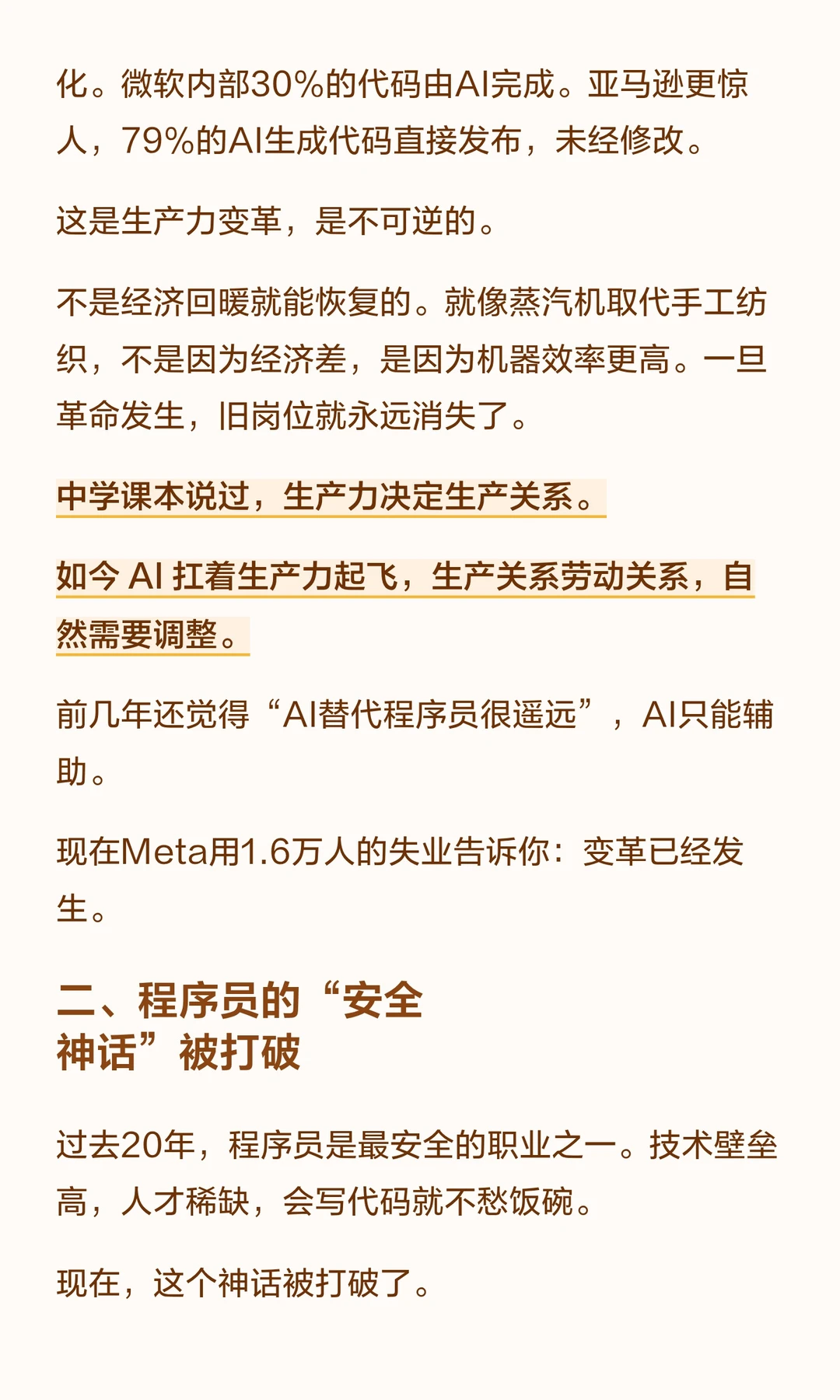 这次的裁员,是因为AI够用。够用到能替代程序员的基础工作:写基础代码、调简单bug、做常规优化。微软内部30%的代码由AI完成。亚马逊更惊人,79%的AI生成代码直接发布,未经修改。