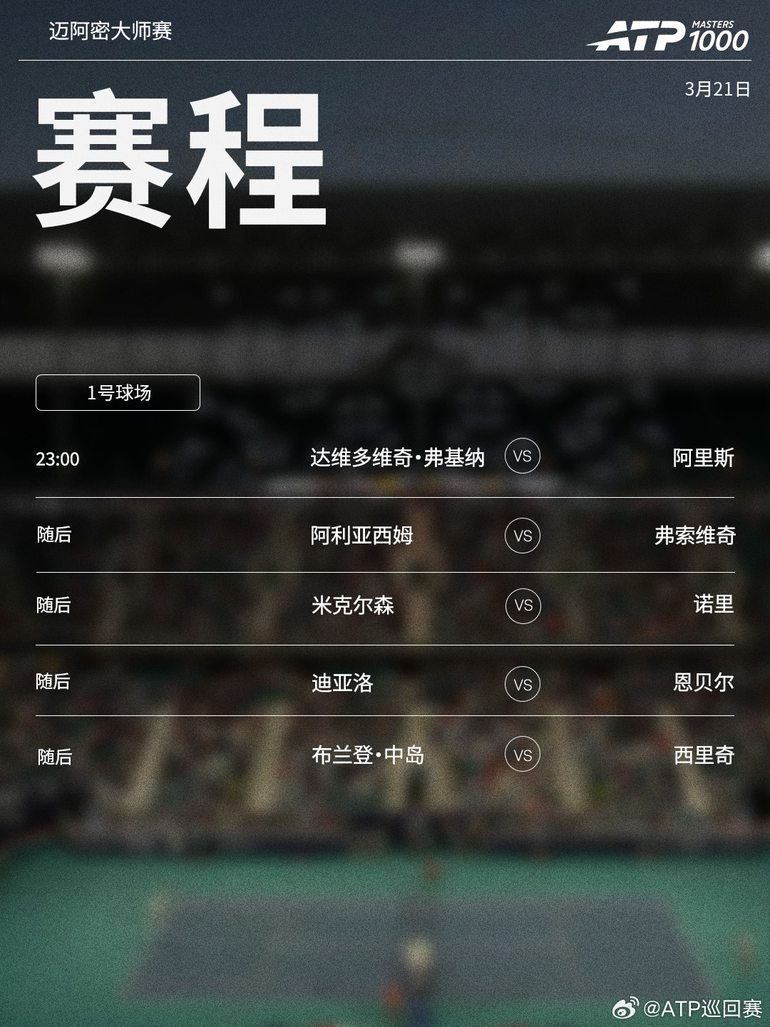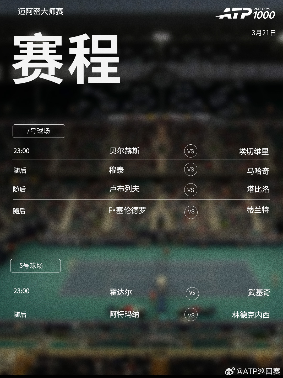 ATP1000迈阿密大师赛今日继续第二轮争夺,赛程见图(均为北京时间)👀