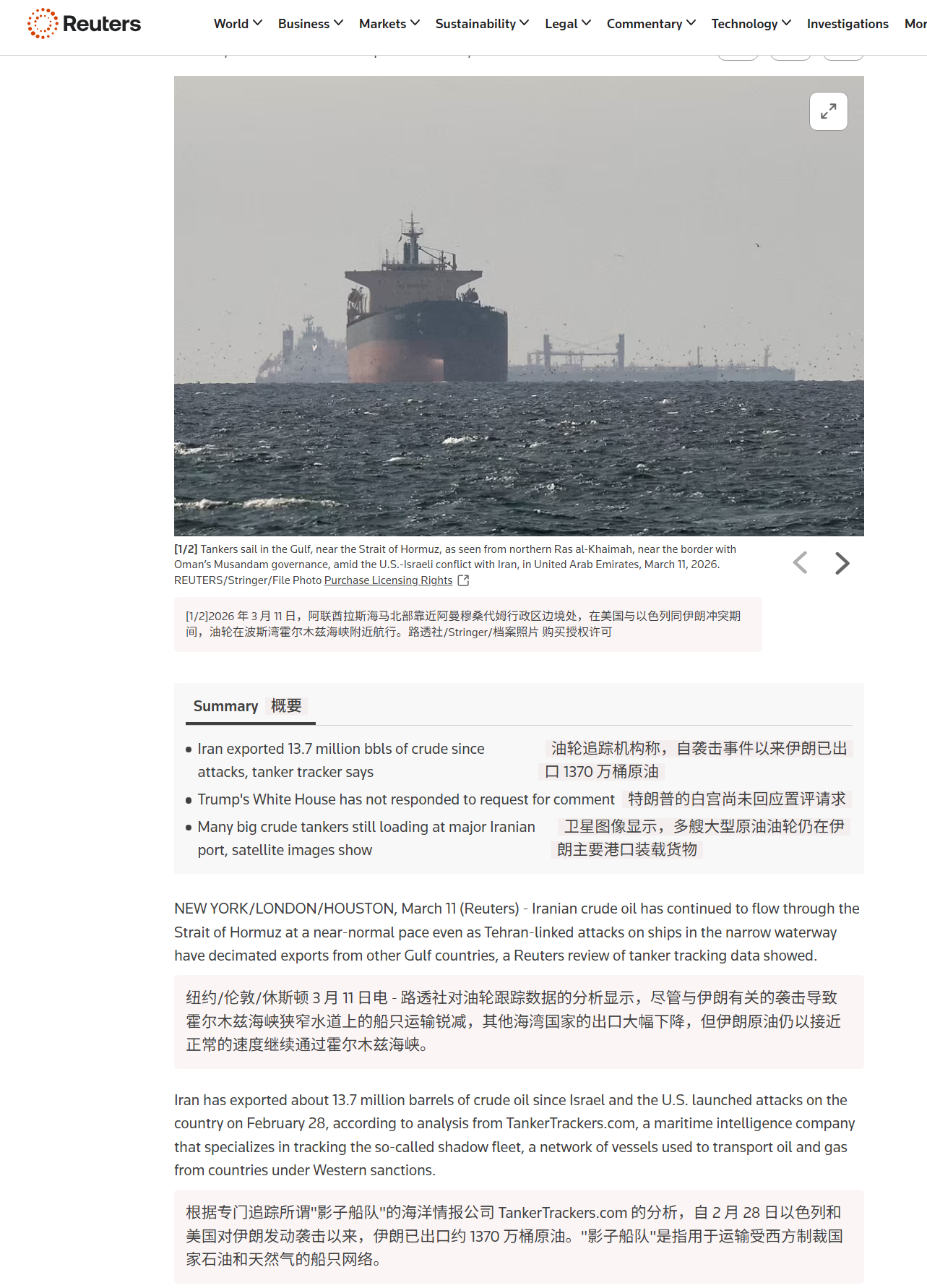 🔻当地时间3月19日,美国财政部长贝森特表示,美国已允许伊朗石油继续经由海湾地区输送,并可能对约1.4亿桶已装运或存放在海上的伊朗石油解除制裁。🔻当地时间20日晚间,伊朗石油部发言人萨曼·戈杜西通过其个人社交账号表示,目前,伊朗基本上已没有剩余原油滞留在海上,也没有多余的原油可供应到其他国际市场,美国财政部长贝森特的相关表态,纯粹是为了给买家制造希望、进行心理安抚,并对市场进行心理调控。🔻第三方数据显示伊朗确有部分浮动储存,但多数已分配给特定买家,与戈杜西说法基本吻合。🔻美国是真没什么招了。以色列全国多地遭导弹袭击美媒称伊朗导弹袭击美英印度洋基地海外新鲜事中东现场直击