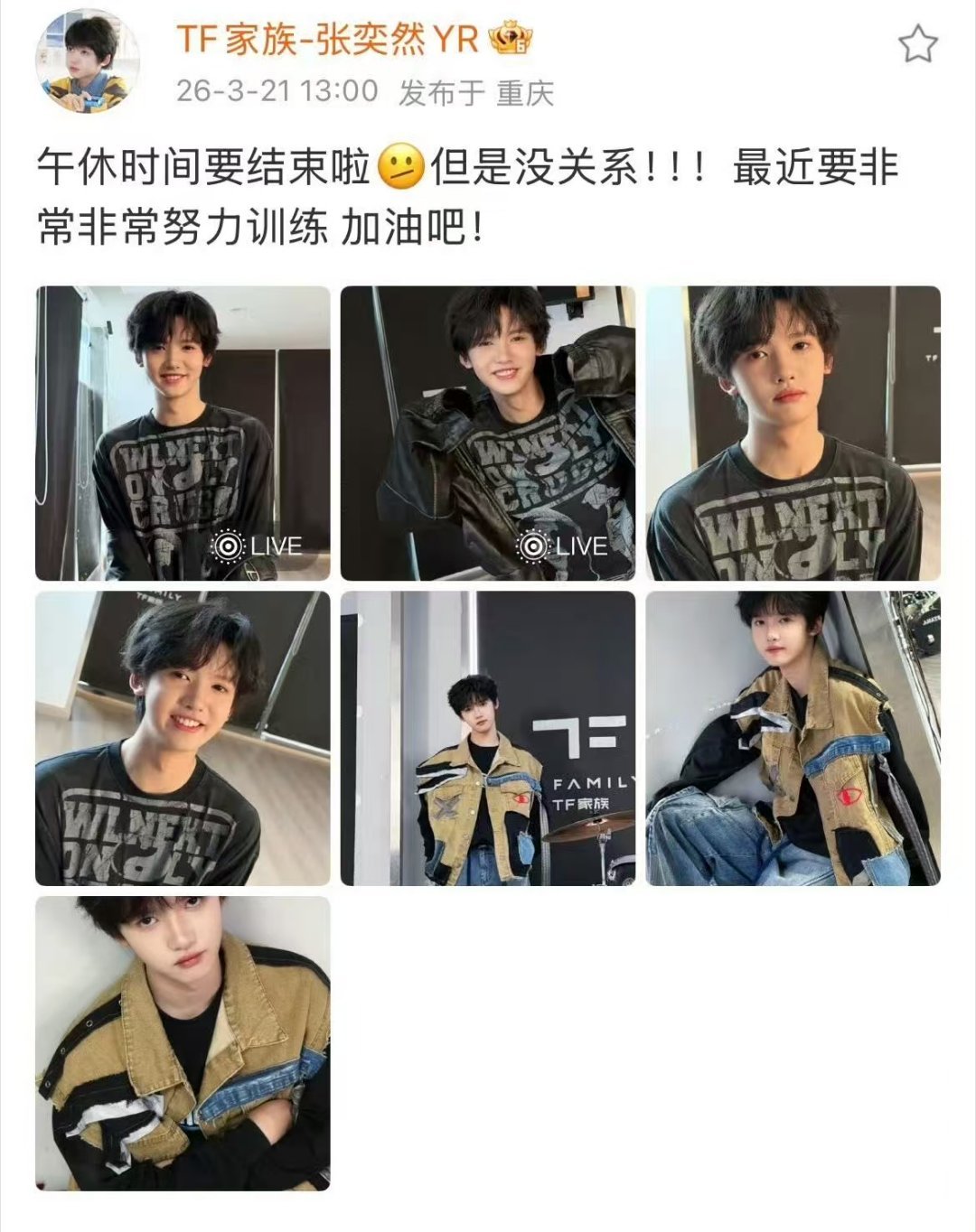 张奕然训练日常plog奕然午间日常更新啦~特别清新帅气的一组照片呀~期待努力训练