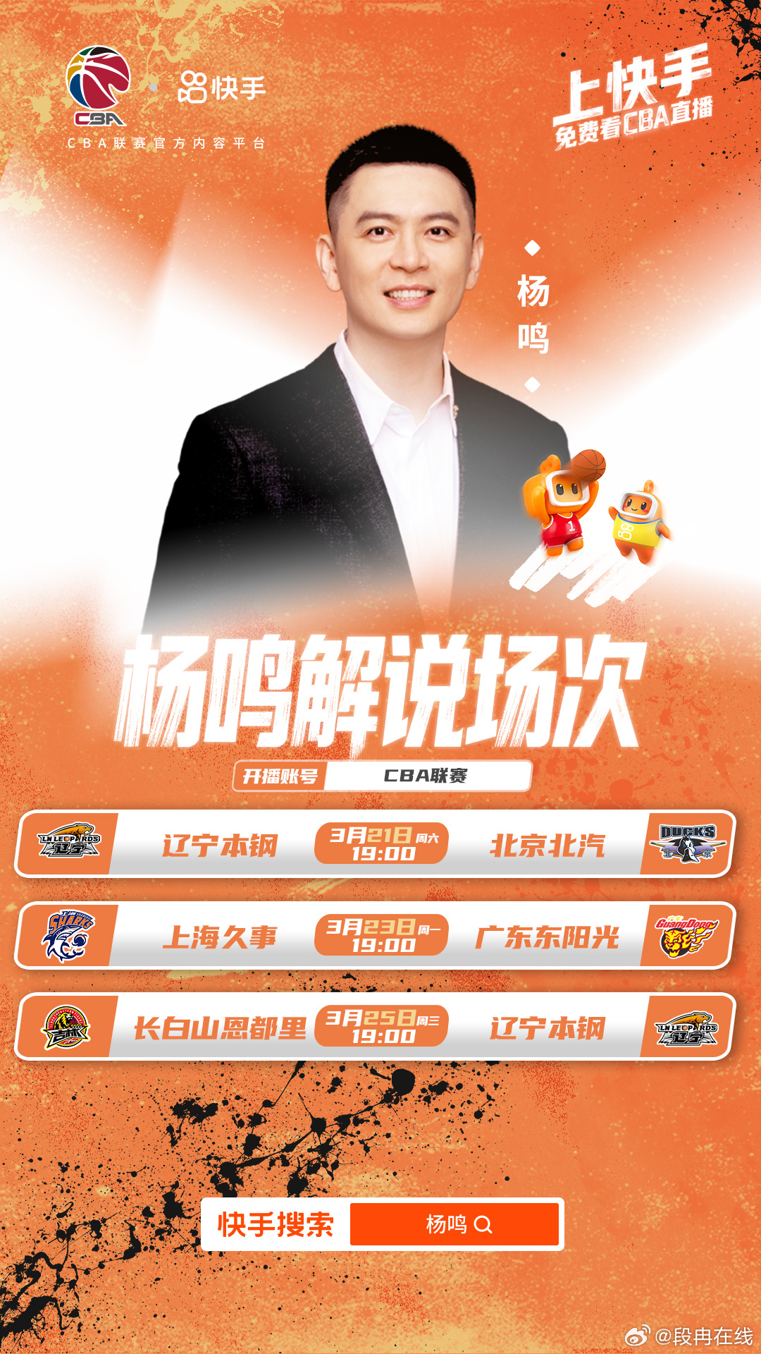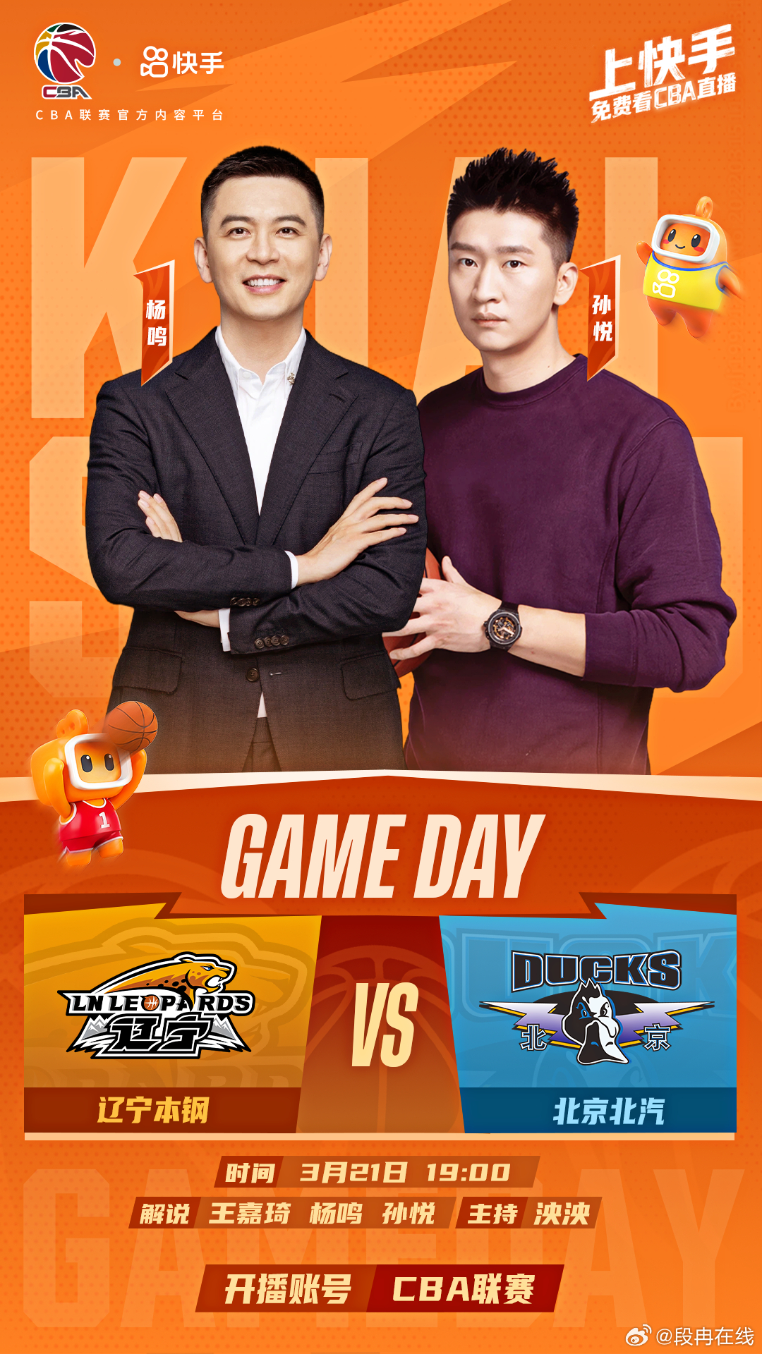 CBA常规赛收官冲刺,今晚焦点大战辽宁对阵北汽,强强对决看点拉满!快手直播重磅加码,杨鸣搭档孙悦坐镇解说席,专业又有梗。解说天团持续升级,山东名宿逍遥王巩晓彬即将登场,还将解说山东队,期待值简直拉满了。今晚来铁厂看球,不错过每一秒精彩!免费看CBA直播