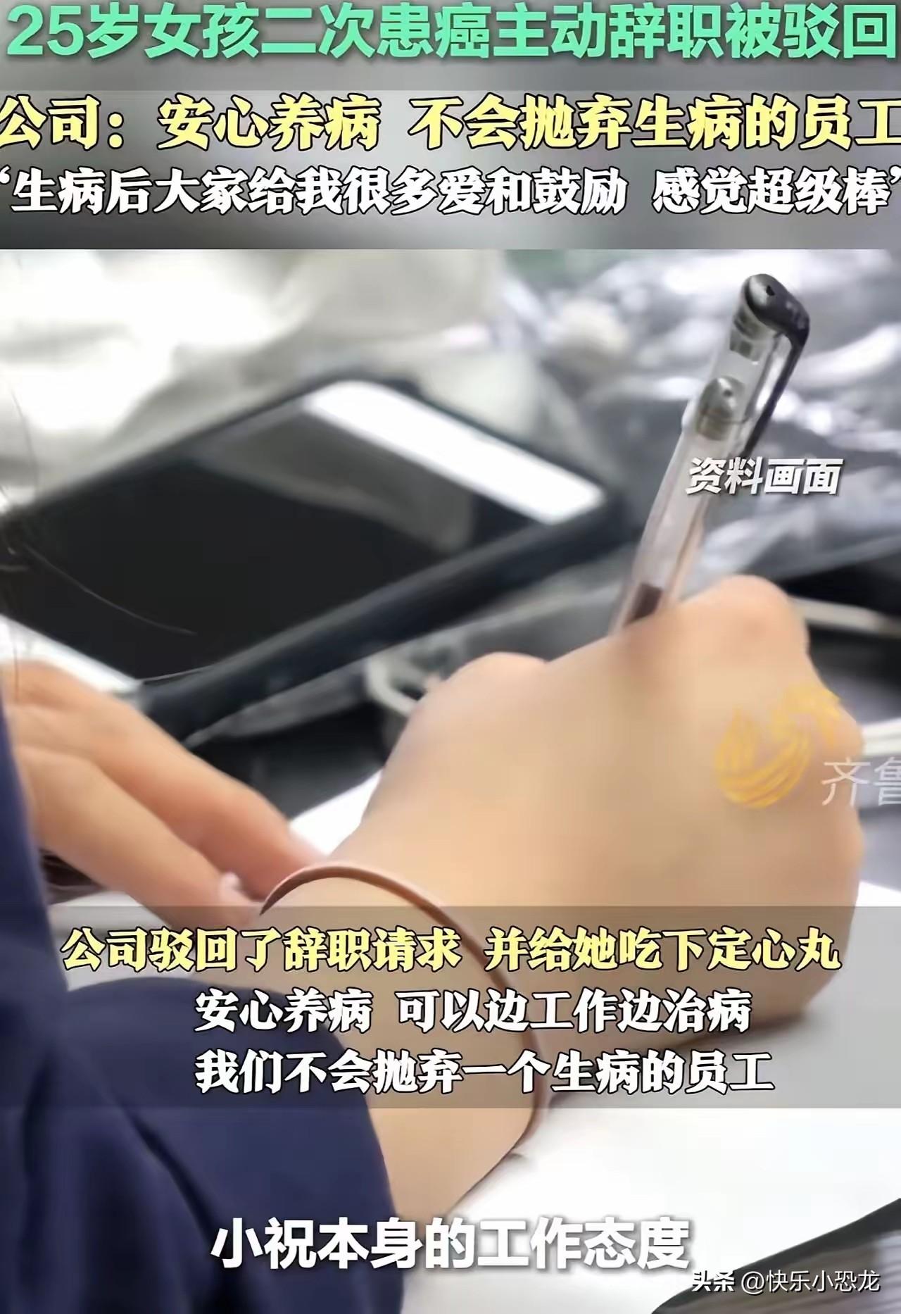 泪目!25岁女子查出直肠癌晚期,最先想到的不是心疼自己,而是怕耽误工作主动提出辞职。没想到领导当场拒绝,还立刻发动全公司为她募捐,凑齐10万元治疗费,让她安心治病。网友纷纷感叹:这样有人情味的公司,才是真正的良心企业! 现在不少职场里都流传着一句话,公司离了谁都能转,员工生病了就只能自己扛着。很多人一旦身体出问题,第一反应不是去看病,而是担心请假太久被替代,担心岗位保不住,担心失去收入来源之后生活彻底陷入困境。 这位25岁的姑娘也是如此,年纪轻轻就遭遇这么严重的病痛,换做是谁都会崩溃,可她第一时间想到的却是不拖累公司,主动提出辞职,不想因为自己的病情影响团队进度。 她的这份懂事,反而更让人心疼。25岁本该是人生最美好的年纪,刚刚步入社会不久,对生活还有很多期待,还没来得及好好享受人生,就要面对癌症晚期这样残酷的结果。 她没有向公司提任何要求,没有索要赔偿,也没有抱怨命运不公,只是默默选择离开,不想成为别人的负担。这种刻在骨子里的善良和体谅,在当下快节奏、重利益的职场里显得格外珍贵。 本以为她的职场之路会就此画上一个冰冷的句号,甚至要独自面对高额的治疗费用和无尽的绝望,可公司领导的做法彻底打破了大家的固有印象。 在收到姑娘的辞职申请时,领导没有丝毫犹豫直接拒绝,没有考虑公司利益受损,没有计较后续的人力成本,反而第一时间安慰她,让她放下所有工作上的顾虑,专心治病。 得知她治疗需要大笔资金,领导立刻在公司内部发起募捐,从管理层到普通员工,大家纷纷伸出援手,很快就凑齐了10万元送到她手上。 那句“安心看病,没钱公司给你想办法”,简单朴实却充满力量,在冰冷的病痛面前,给了这个姑娘最温暖的支撑。 对比现实中很多公司对待患病员工的冷漠态度,这家企业的做法无疑让人眼前一亮。 不少打工人都有过类似的经历,身体不适请假会被质疑矫情,生病住院期间被变相劝退,甚至还有公司想方设法规避责任,让员工独自承担一切。 职场似乎慢慢变成了只讲利益不讲人情的地方,员工与公司之间只剩下雇佣关系,缺少最基本的温度和关怀。 大家都在为了生计奔波,不敢生病、不敢请假,久而久之,人与人之间的善意也被慢慢消磨。 这家公司用实际行动告诉大家,企业不仅仅是创造利益的场所,更应该是一个有温度的集体。员工为公司付出青春和汗水,公司在员工遭遇困境时伸出援手,这才是良性的职场关系。 真正的好公司,从不是靠严苛的制度压榨员工,而是用善意留住人心,用担当凝聚力量。一个懂得体恤员工的企业,自然也能收获员工的忠诚与付出,长远来看,这远比一时的利益更有价值。 我们总在抱怨职场冷漠,抱怨人心复杂,可这件事让我们看到,善意一直都在。一个懂事的姑娘,一群暖心的同事,一位有担当的领导,拼凑出了最动人的职场温情。 人生难免遭遇风雨,在最艰难的时候,有人拉一把、帮一把,就足以支撑一个人走过黑暗。比起冰冷的制度和利益,人与人之间的体谅与帮扶,才是最难得的财富。 各位读者你们怎么看?欢迎在评论区讨论。
