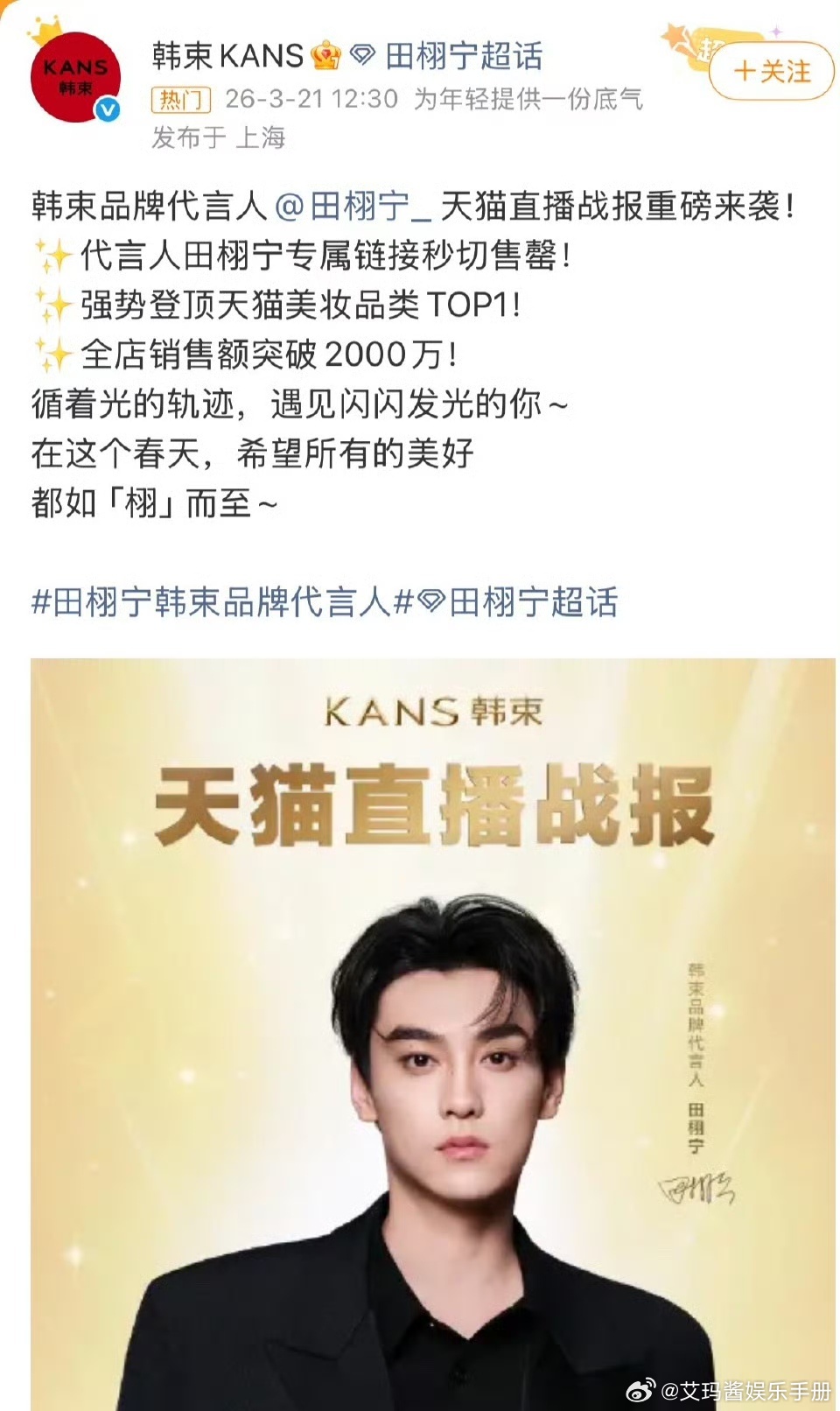 不是昨天才直播,今天还发了商务战报啊网传内娱再无田栩宁了