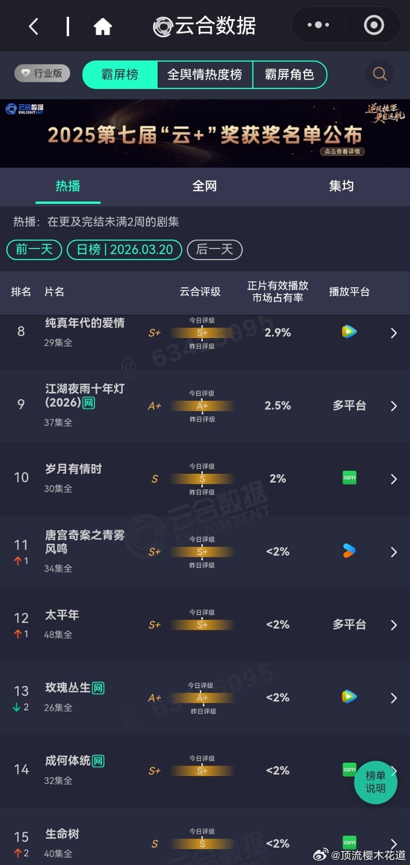 3月20日云合播放占比云合 酷云逐玉云合46.4%,酷云46.6%这集均得破亿了