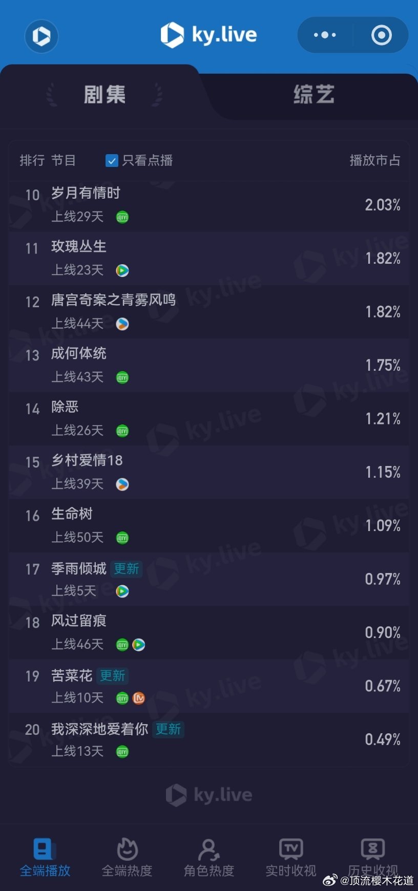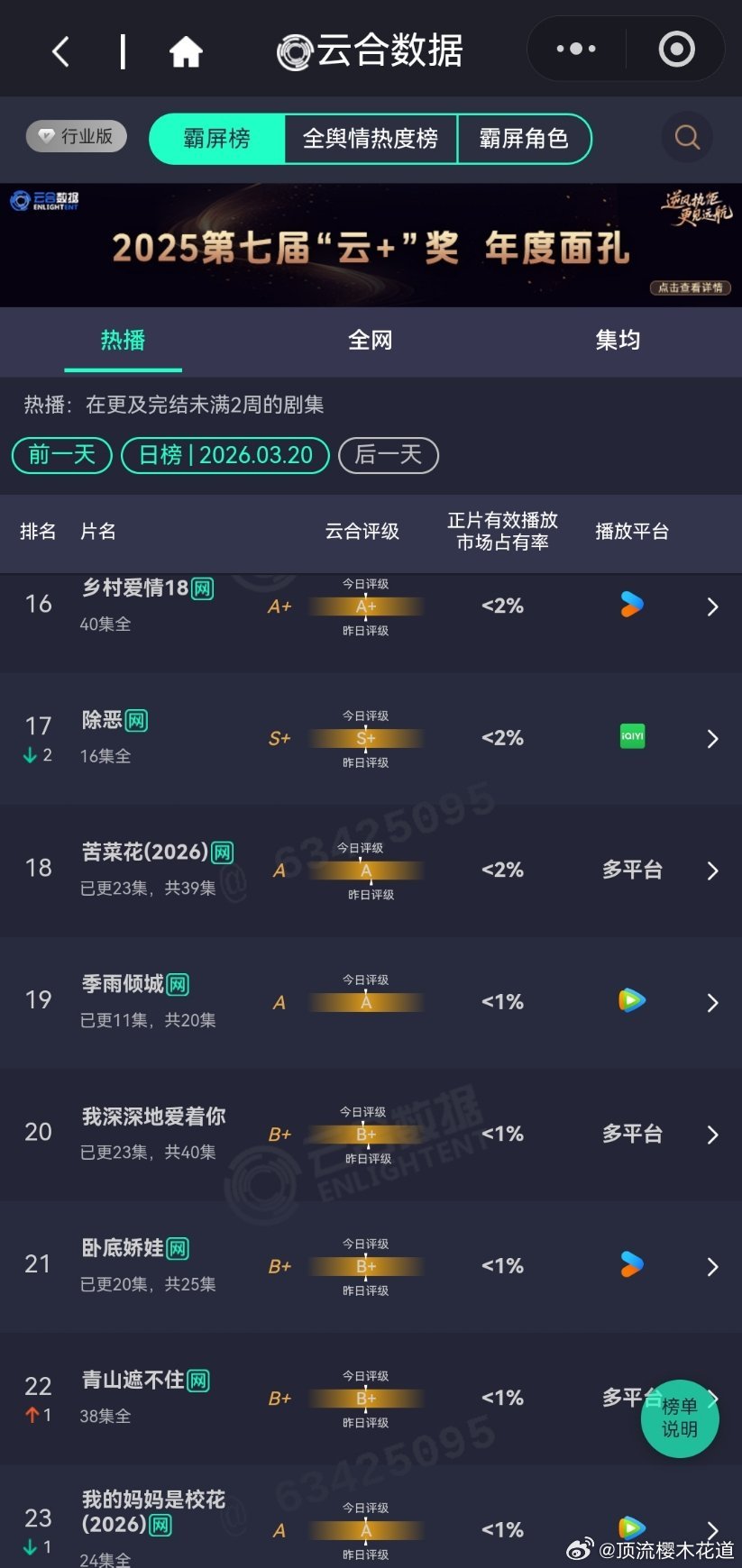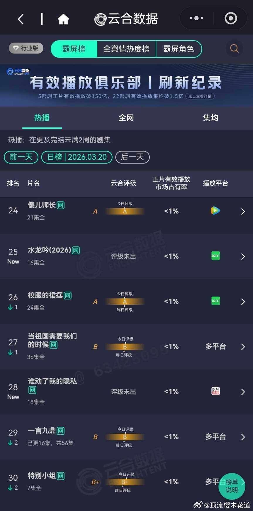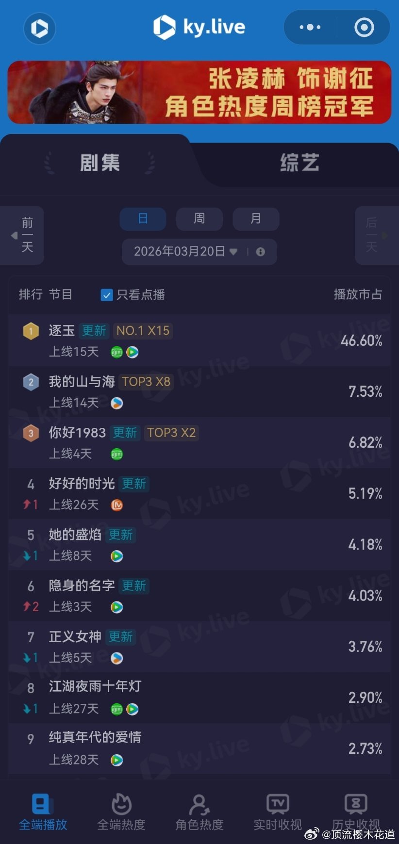3月20日云合播放占比云合 酷云逐玉云合46.4%,酷云46.6%这集均得破亿了。你好1983云合6.5% 酷云6.82%横盘了。