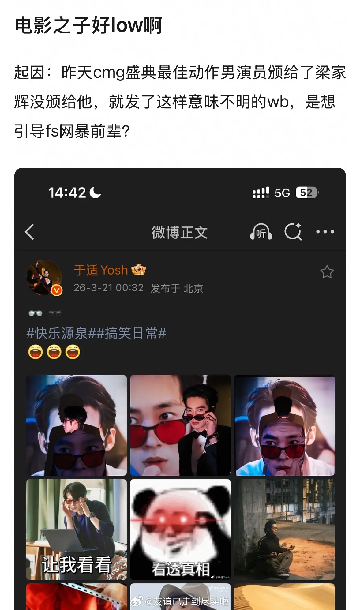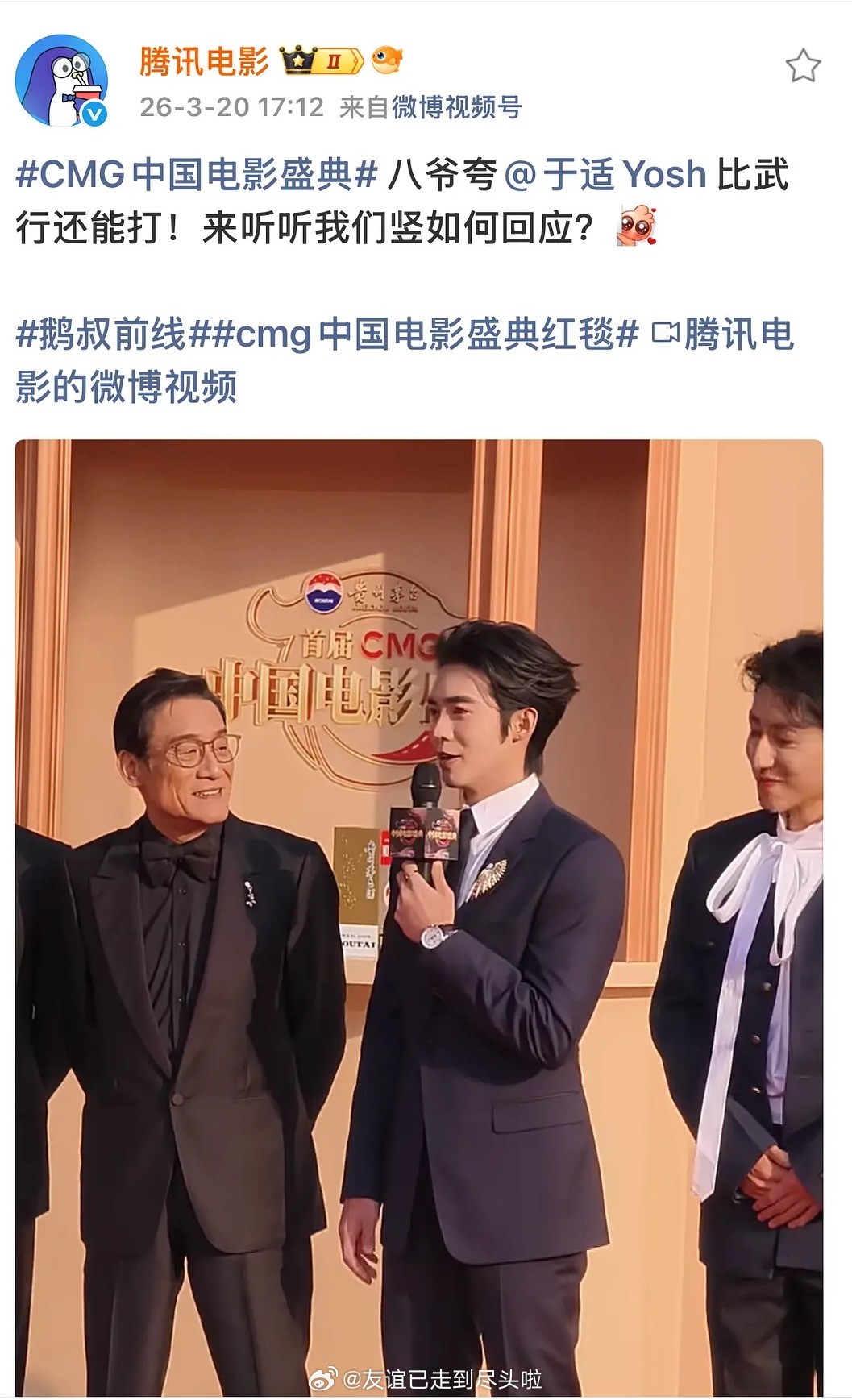 昨天于适的微博,郫县er解读说是因为cmg的最佳动作男演员颁给了梁家辉随后粉丝澄