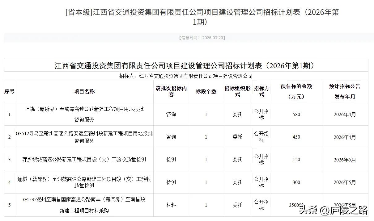好消息,江西5条高速公路新进展来了。 近日,江西省交通投资集团有限责任公司项目建设管理公司发布招标计划表(2026年第1期),上鹰、安赣、萍绕、通铜、丰昌等高速项目相关招标计划位列其中。 其中,上饶(赣浙界)至鹰潭高速公路新建工程项目和G3512寻乌至赣州高速公路安远至赣州段新建工程项目发布用地报批咨询服务,标志着上鹰高速和安赣高速即将进入用地报批阶段,预计这两个项目今年将开工。 G1535潮州至南昌国家高速公路南丰(赣闽界)至南昌段新建工程项目发布材料采购招标计划,标志着丰昌高速即将进入大规模施工阶段。 萍乡绕城高速公路新建工程项目和通城(赣鄂界)至铜鼓高速公路新建工程项目发布竣(交)工验收质量检测招标计划,标志萍绕高速和通铜高速已进入冲刺阶段,预计这两个项目将于今年或明年通车。