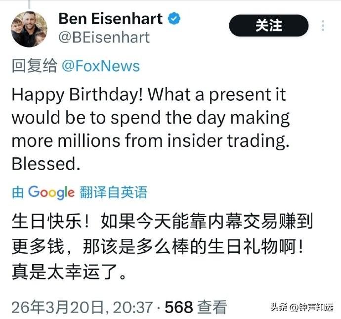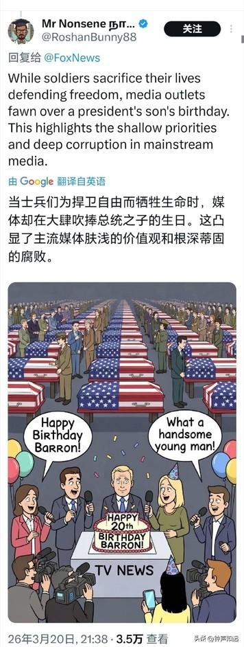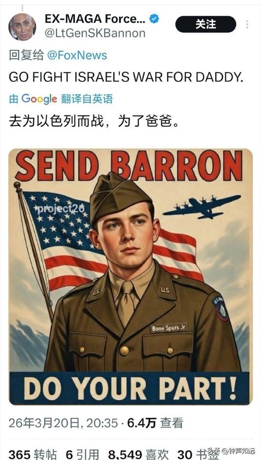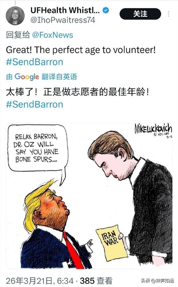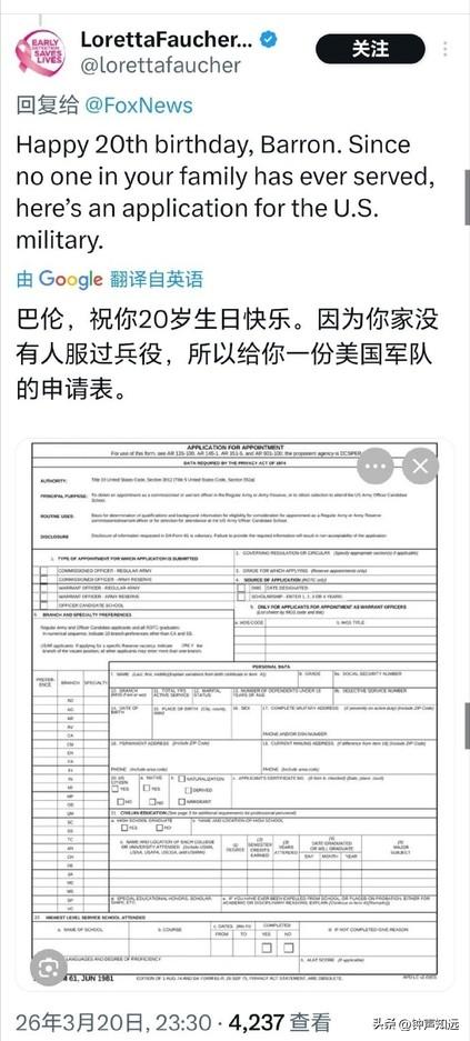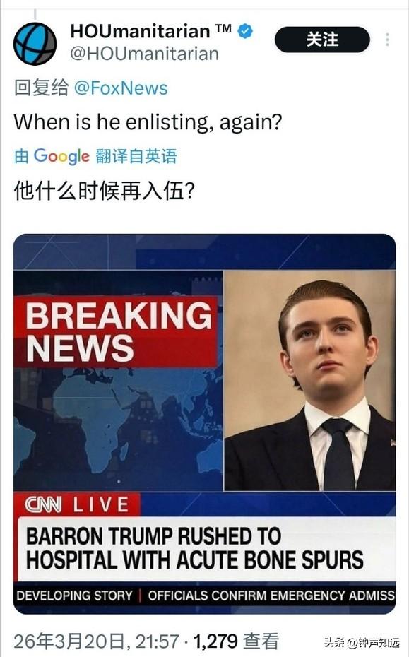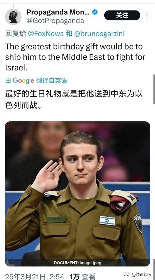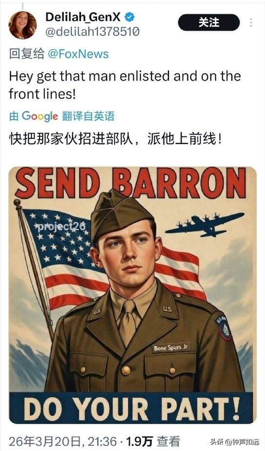 福克斯祝特朗普儿子生日快乐,这马屁拍的美国网友不买账,评论“他什么时候入伍?” 3月20日是特朗普的小儿子巴伦・特朗普的20岁生日,福克斯新闻第一时间在官网、X 平台同步发文祝贺,这以后福克斯肯定不会是“假新闻”了,采访必须站第一排。 不过美国网友的评论可不那么“快乐”。 有网友评论“最好的礼物就是把他送到中东为以色列而战”。 “当士兵们为捍卫自由牺牲生命时,媒体却在大肆吹捧总统儿子的生日,这凸显了媒体的肤浅价值观和根深蒂固的腐败” “快把那家伙招进部队,让他上前线” 还有人把特朗普一家都没服过兵役的事拿出来,送给了他一张美国军队申请表。 也难怪,特朗普本人在越战时期以 “足跟骨刺” 为由5次豁免兵役,却曾是军校的运动健将。 长子小唐纳德频繁以 “总统长子” 身份“秀肌肉”,但也没有参军记录。 巴伦的20岁生日正好赶上美国全志愿兵役制17到35岁的入伍年龄区间,现在去当兵正好。 有人100%确信这家伙有一天会成为美国总统,不过还是有更讽刺现实的网友“如果能靠内幕交易赚更多钱,那是多棒的生日礼物”