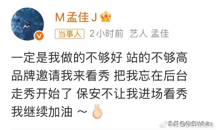 孟佳,9个嘉宾都能把我漏了公开控诉某活动方邀请她来看走秀却把她忘在后台,走秀开始了保安还不让她进场,据悉这次活动嘉宾一共9人,9个人都能把她漏掉,这个活动方是有多不把她当一回事?孟佳自己也自嘲“一定是我做的不够好,站的不够高”,重点是后面那句,其实还是内娱那句老话,不红是罪,红了什么都对,如果换成一个当红的艺人,又是另外一种状态,不说众星捧月,也会有专人对接吧!