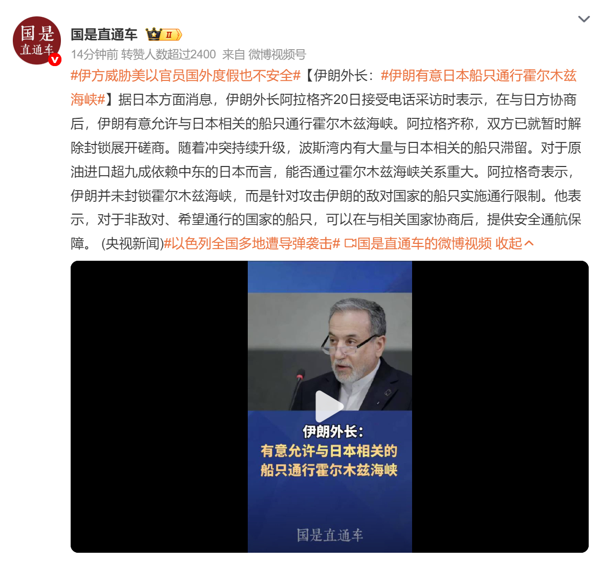 🔻伊朗实际上给出了一道选择题:如果与伊朗协商就能沟通霍尔木兹海峡,为什么还要加入美以攻击伊朗的队伍呢?🔻前提是伊朗真的能堵住海峡,还能揍波斯湾国家的能源设施。🔻这道题不难回答。但是结果可能不会让特朗普团伙满意。伊朗有意日本船只通行霍尔木兹海峡曝伊朗在霍尔木兹开了安全通道海外新鲜事中东现场直击