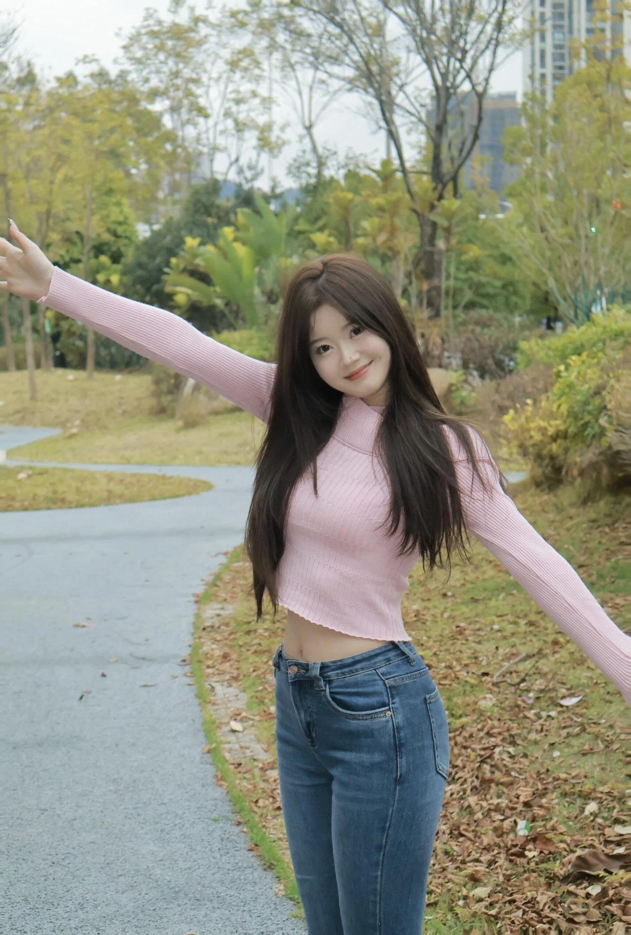 青春美少女,摩登牛仔裤穿搭,春日室外尽情展示美丽。你觉得女人最重要的是美貌还是人
