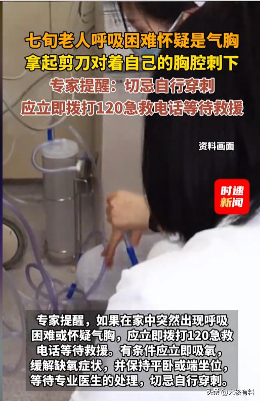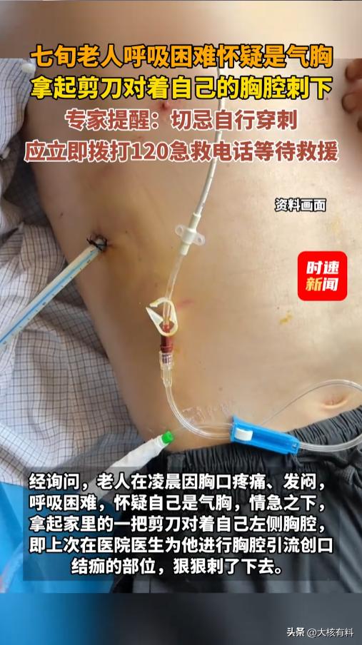 “真是个狠人!”3月19日,湖北武汉,一位七十多岁的老人突然感觉自己胸闷气短,怀疑是气胸。老人以前在医院做过胸腔引流,情急之下,他拿起剪刀,对准自己以前的创口就刺了下去。没多久就被紧急送往了医院。网友:千万别学! 在家里犯病了怎么办?当然是抓紧打急救电话啊,可千万别自己瞎学医生的操作,给自己动刀动针的,专业的活,就得交给专业的人。 当日凌晨,老人在家突然感觉自己呼吸困难,胸口还疼,他怀疑是自己气胸又犯了。之前他在医院做过胸腔引流,现在那个创口还结着痂呢。 老人情急之下,学着医生的样子,抄起剪刀,对准结痂的地方,狠狠刺了下去。他还自制了引流管,前端用的酸奶吸管,中间用的吸氧管,还连了个矿泉水瓶。 没过多久,老人就被紧急送往了医院,医护人员看到老人身上这一幕,都有些震惊。 到医院后,医生赶紧给老人重新做了胸腔引流,把老人自己整出来的伤口都做了消毒处理,又换了无菌引流管。还好老人没有出现严重的感染,目前生命体征比较平稳。 专家提醒,出现急症一定要立即拨打120等候救援。如果怀疑自己是气胸,有条件就抓紧吸氧缓解,没有的话,就好好平躺着,或者端正坐好。 千万千万不要自行做穿刺!千万千万不要自行做穿刺!千万千万不要自行做穿刺! 信息来源:《七旬老人呼吸困难怀疑是气胸,拿起剪刀对着自己的胸腔刺下 专家提醒:切忌自行穿刺,应立即拨打120急救电话等待救援》时速新闻