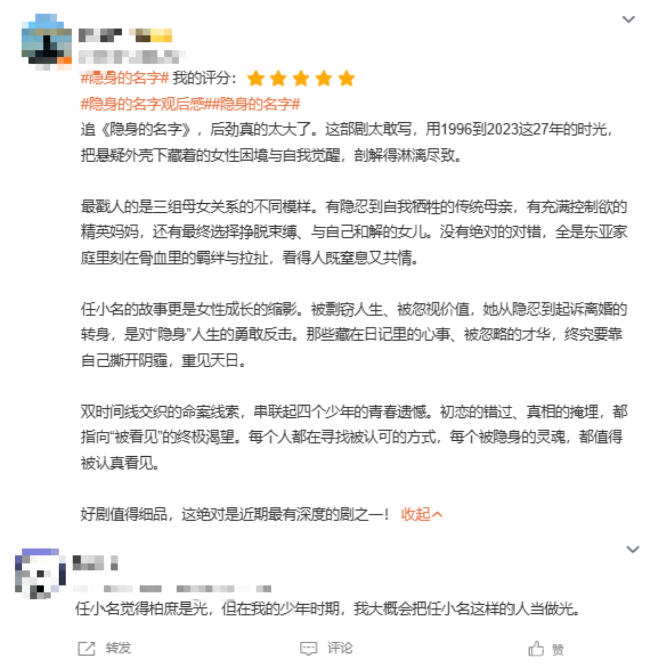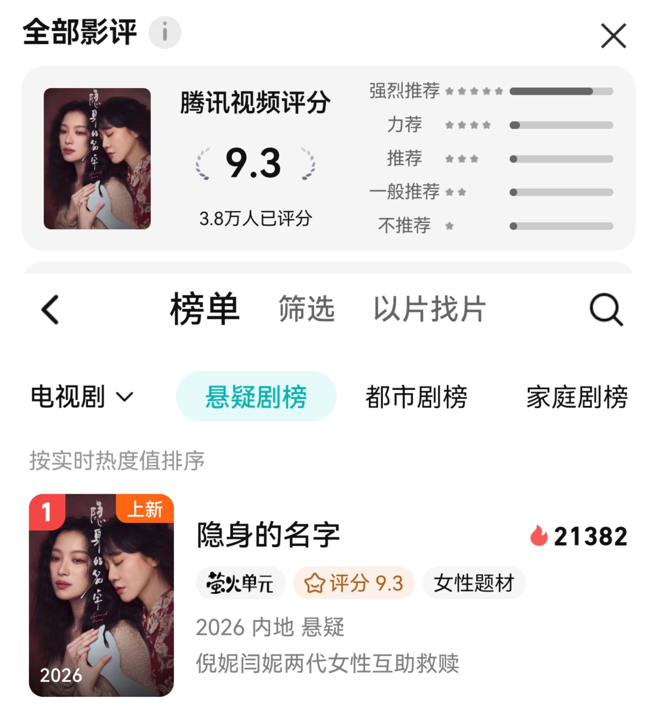 倪妮新剧口碑 演悬疑剧真的直接杀死比赛!《隐身的名字》站内 9.3 分稳居悬疑剧榜 TOP1,热度口碑双丰收,姐的实力果然从来不会让人失望!原生家庭带来的敏感与防备,婚姻里被隐身的委屈与不甘,从破碎隐忍到绝地反击,每一处情绪都被拿捏!做倪妮的剧粉到底拿什么输~隐身的名字