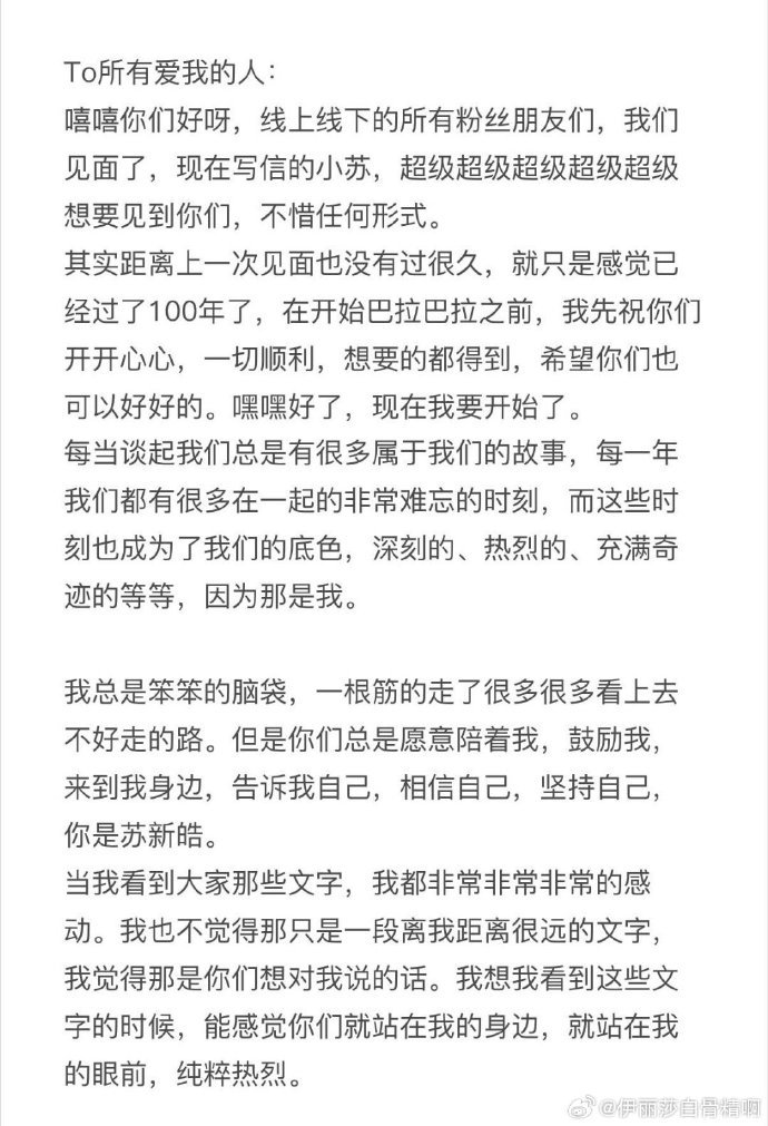 苏新皓给粉丝写的信苏新皓写给粉丝们的信,没有刻意煽情,只有字字真心。文字版“我会