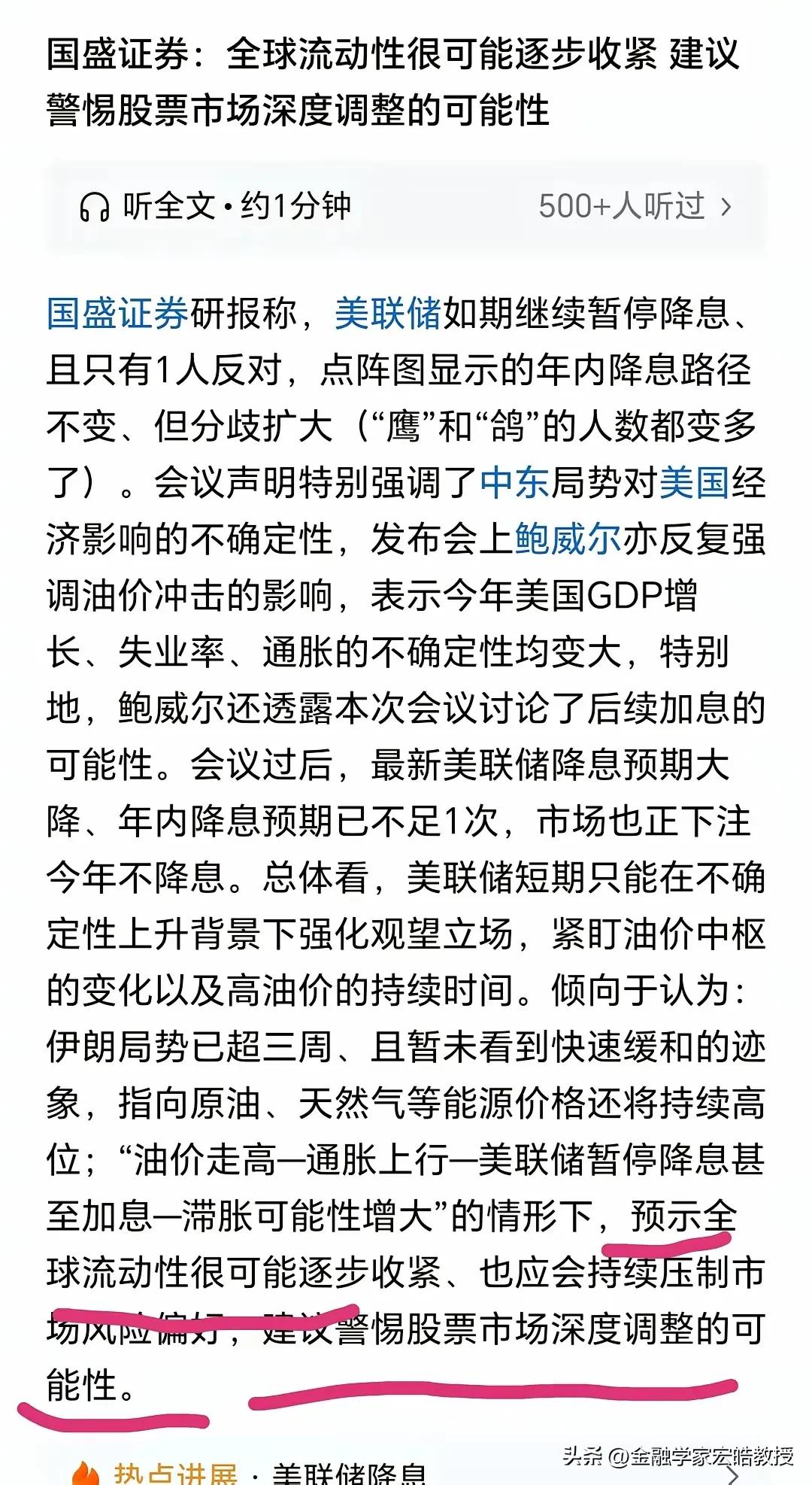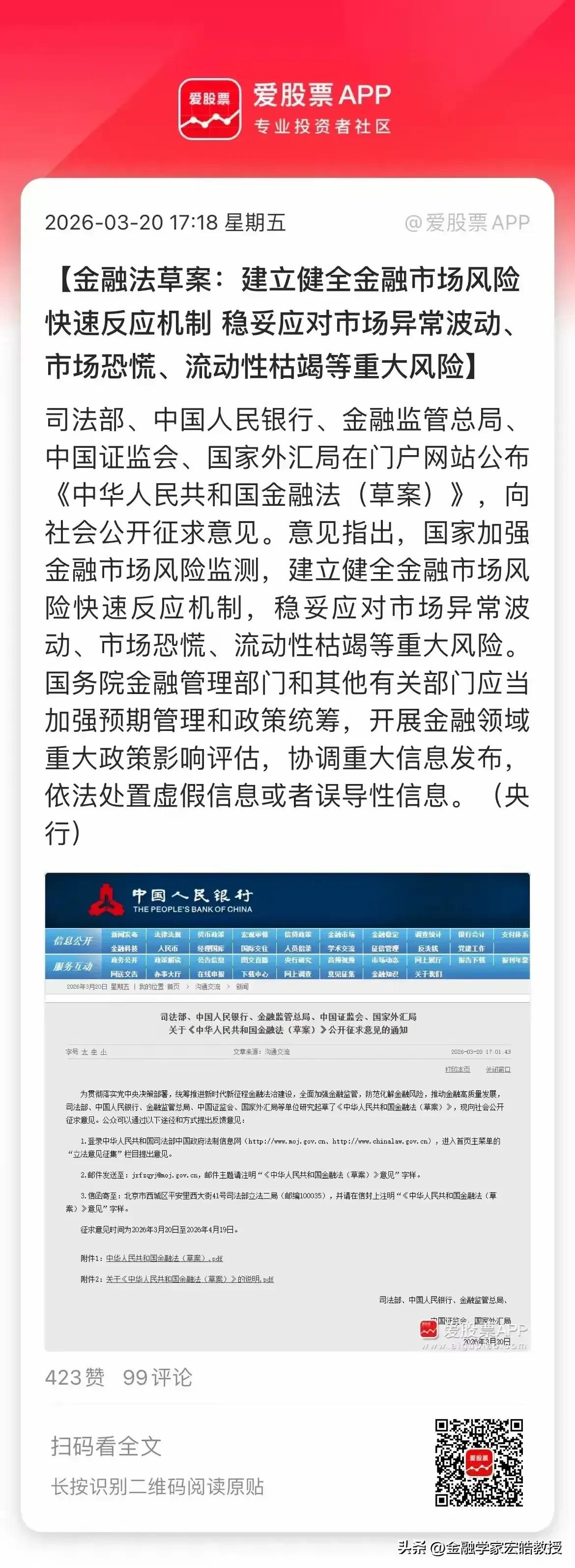 金融法草案落地,国盛证券为何会发股市深度调整的预警? 金融法筑牢维稳防线,本是提振信心的针,国盛却拉深调预警,看似矛盾实则逻辑通透。 其依据是外部流动性逆风:美联储暂停降息且讨论加息,中东局势推高油价,全球流动性收紧已定。但是,中国股市却不同。今年一季度国家队入场资金已超1200亿,提前护盘布局。 要知道,当年从3000点到4000点,国家队累计投入超万亿资金托底。如今若再深幅度大跌,长线资金难盈利,市场信心难修复。监管层在这个时刻立法维稳,国家队提前进场,是可以在外部不确定的情况下抵挡住外部逆风,当前A股正于内外博弈中静待企稳。