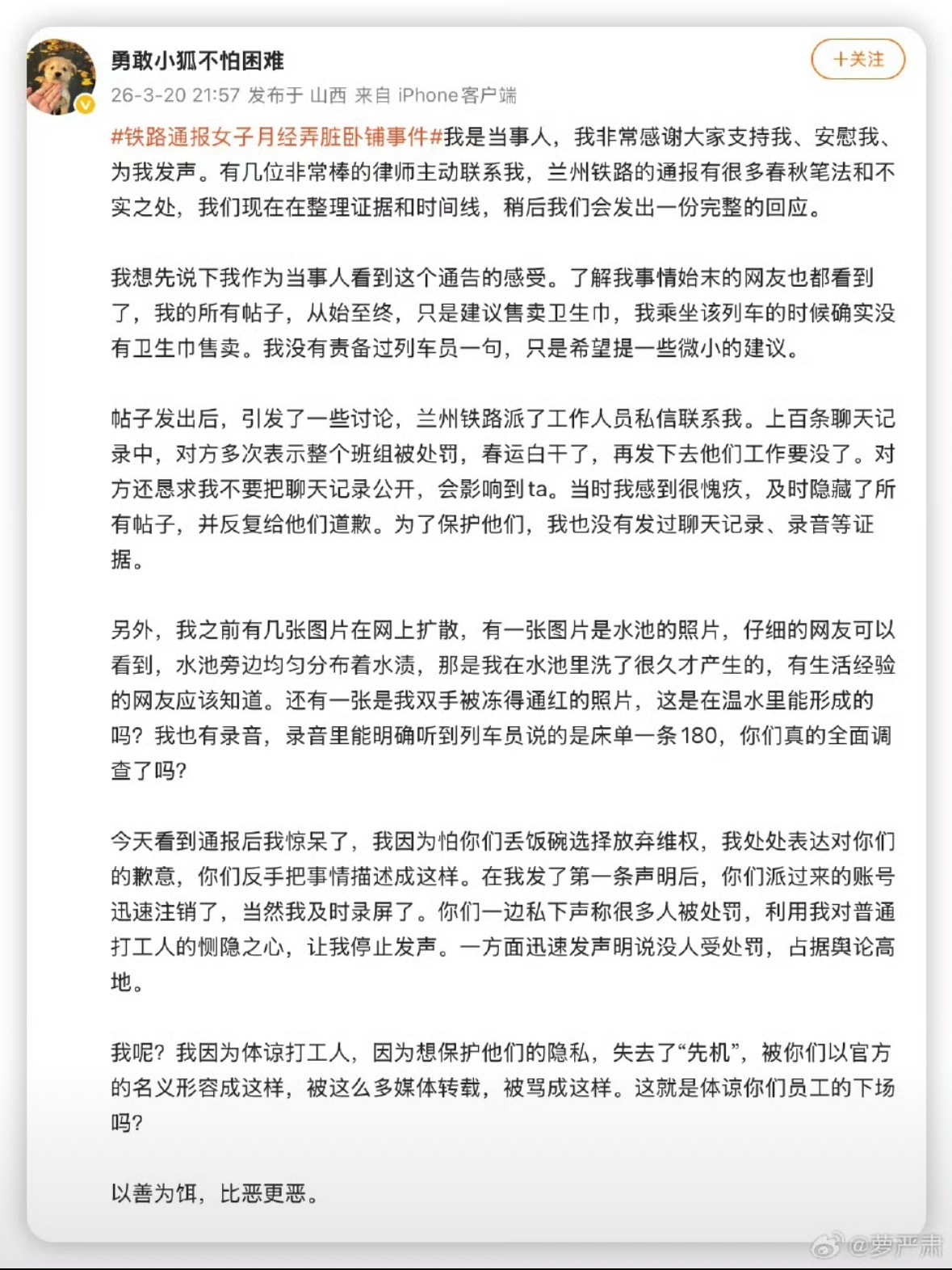月经弄脏卧铺当事人详述事件经过这个事件上热搜开始我就全程都去关注并且了解相关的信