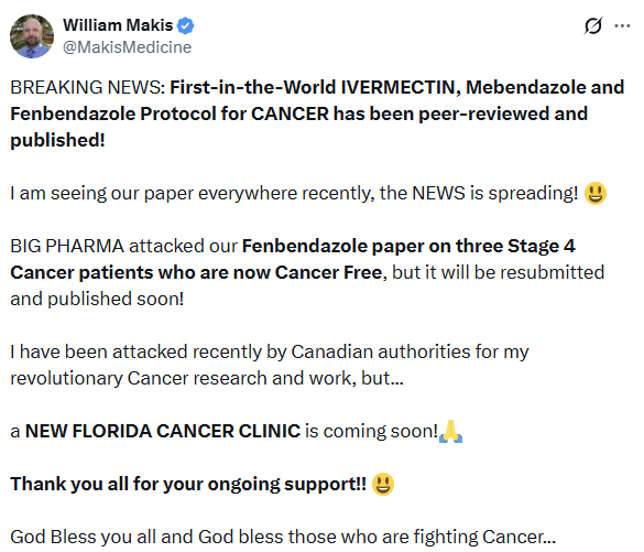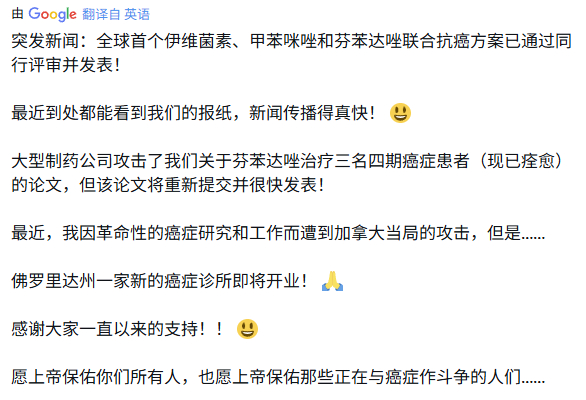 突发新闻:全球首个伊维菌素、甲苯咪唑和芬苯达唑联合抗癌方案已通过同行评审并发表!