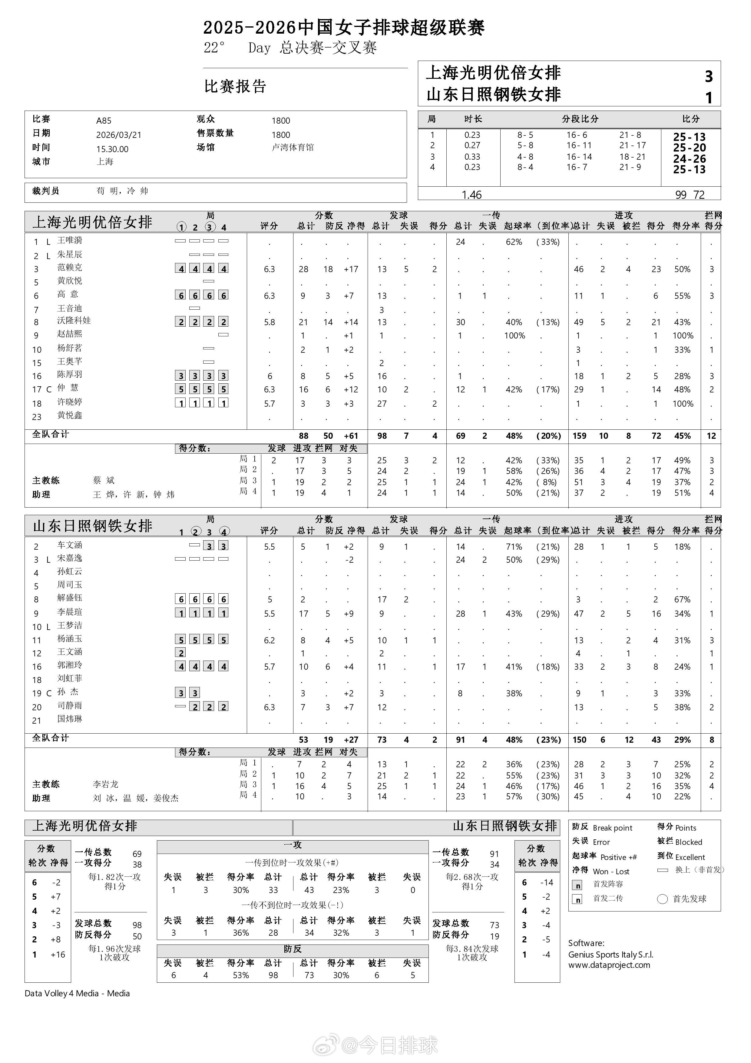 中国女排超级联赛 A级半决赛次回合上海3-1山东得分统计。