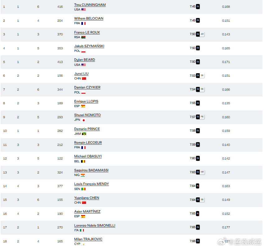 陈圆将最后一组出场,他以7秒64的赛季最佳战绩,拿到小组第三,同样直接晋级。预赛总排名第15位。