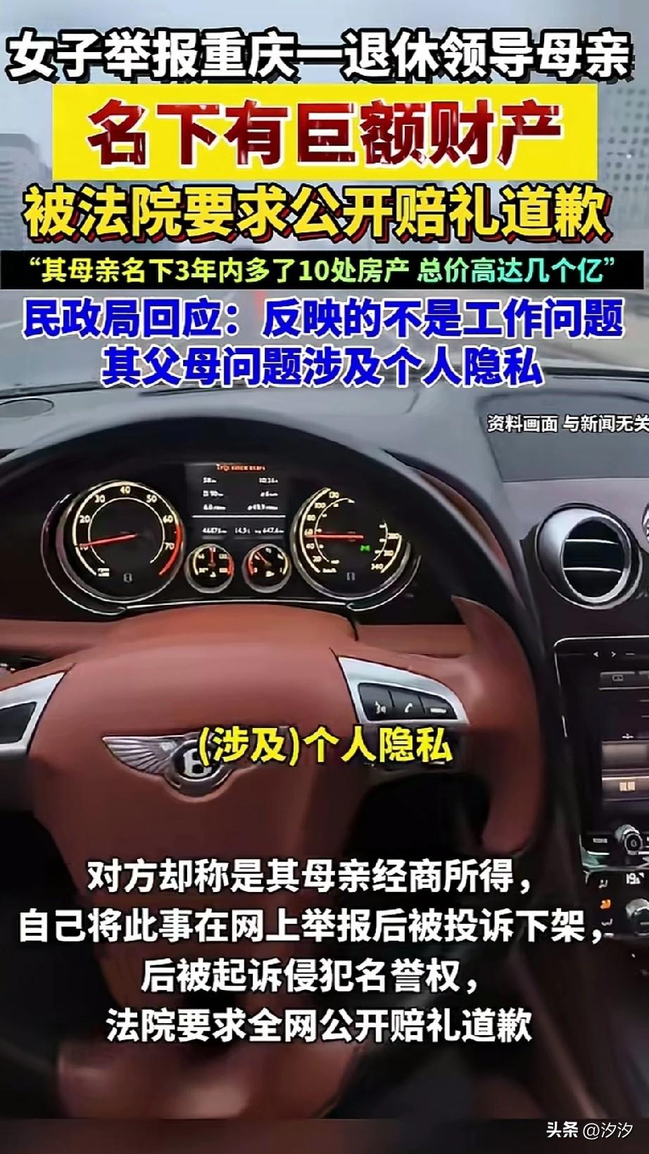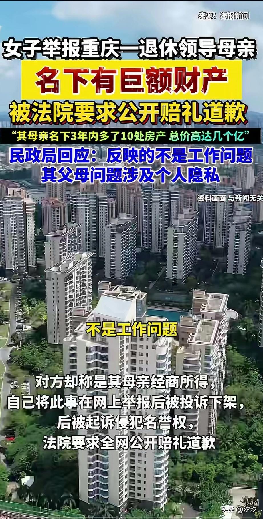 女子举报重庆一退休留老母亲, 三年内名下多了十几套房产, 价值高达上亿, 后被对方投诉下架, 当地有关部门表示已经注意到此事, 男子将女子告上法庭, 法院判决侵犯隐私权, 要求向他母亲公开道歉, 还说自己母亲名下的房产, 都是自己母亲经商经营所得, 这明显站不住脚, 退休领导的母亲得多大了? 还能去经商获利高达数亿, 动动脚趾头就知道是怎么回事, 难道退休就能安全下车吗? 这种风气可开不得, 重庆这位母亲是做什么生意的? 三年内居然能赚高达数亿元, 这简直不可想象, 有本事就提供经经营所得的证明? 否则就该查查这位退休的领导了, 大家觉得重庆这事登上热搜之后会怎么样? 重庆身边事 重庆爆料