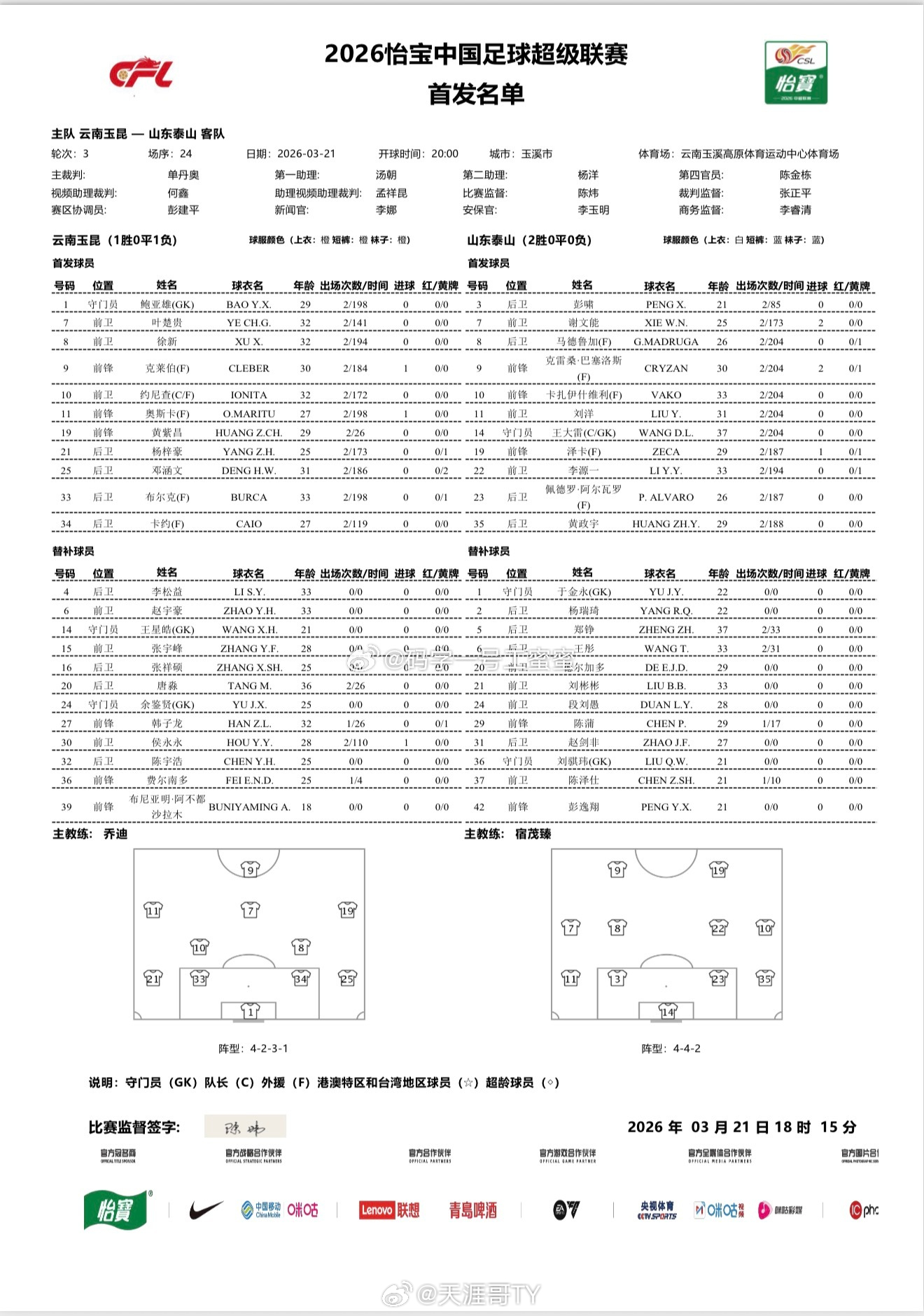 云南玉昆vs山东泰山云南玉昆vs山东泰山首发 彭啸替换了半月板受伤的高准翼打完这