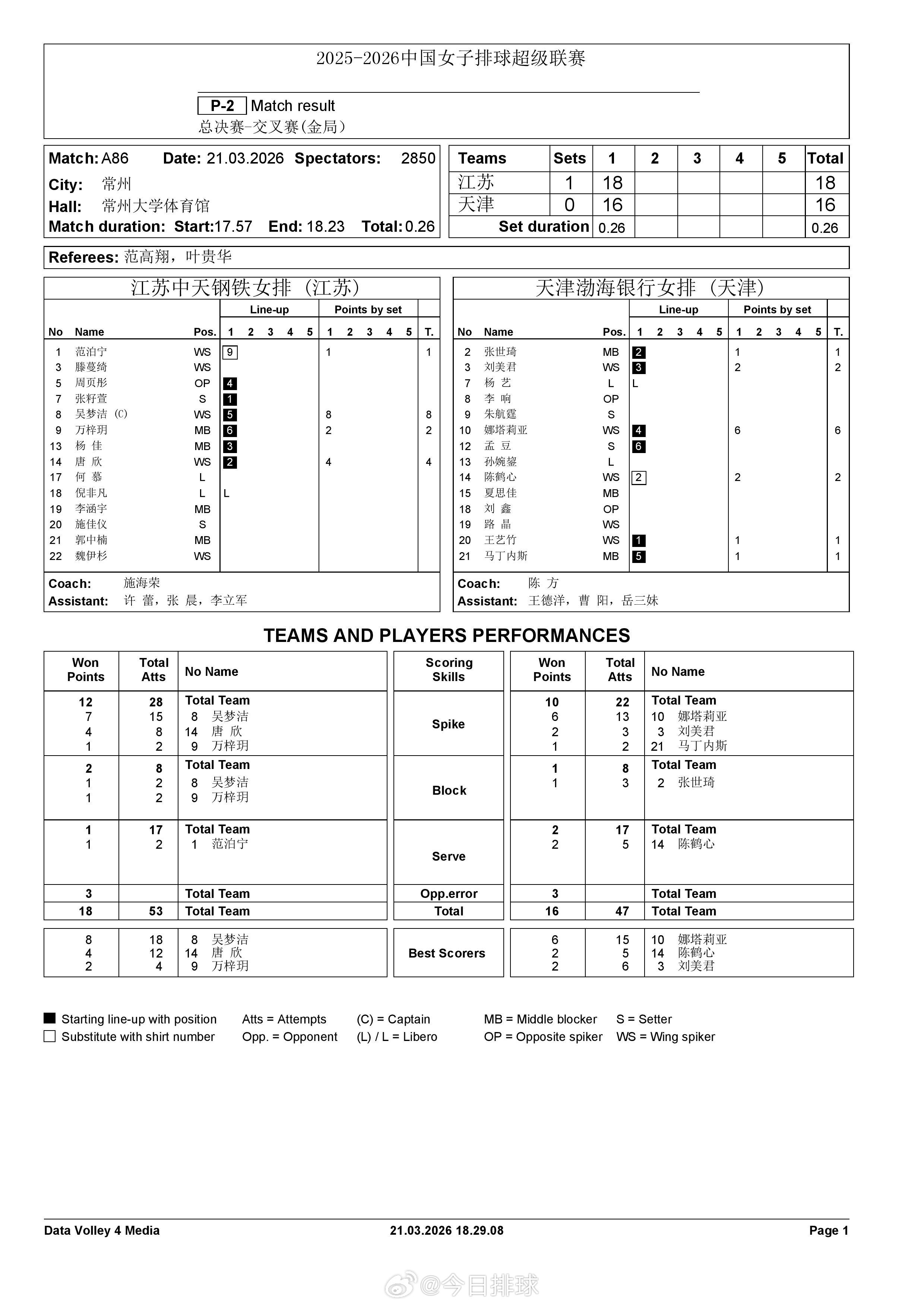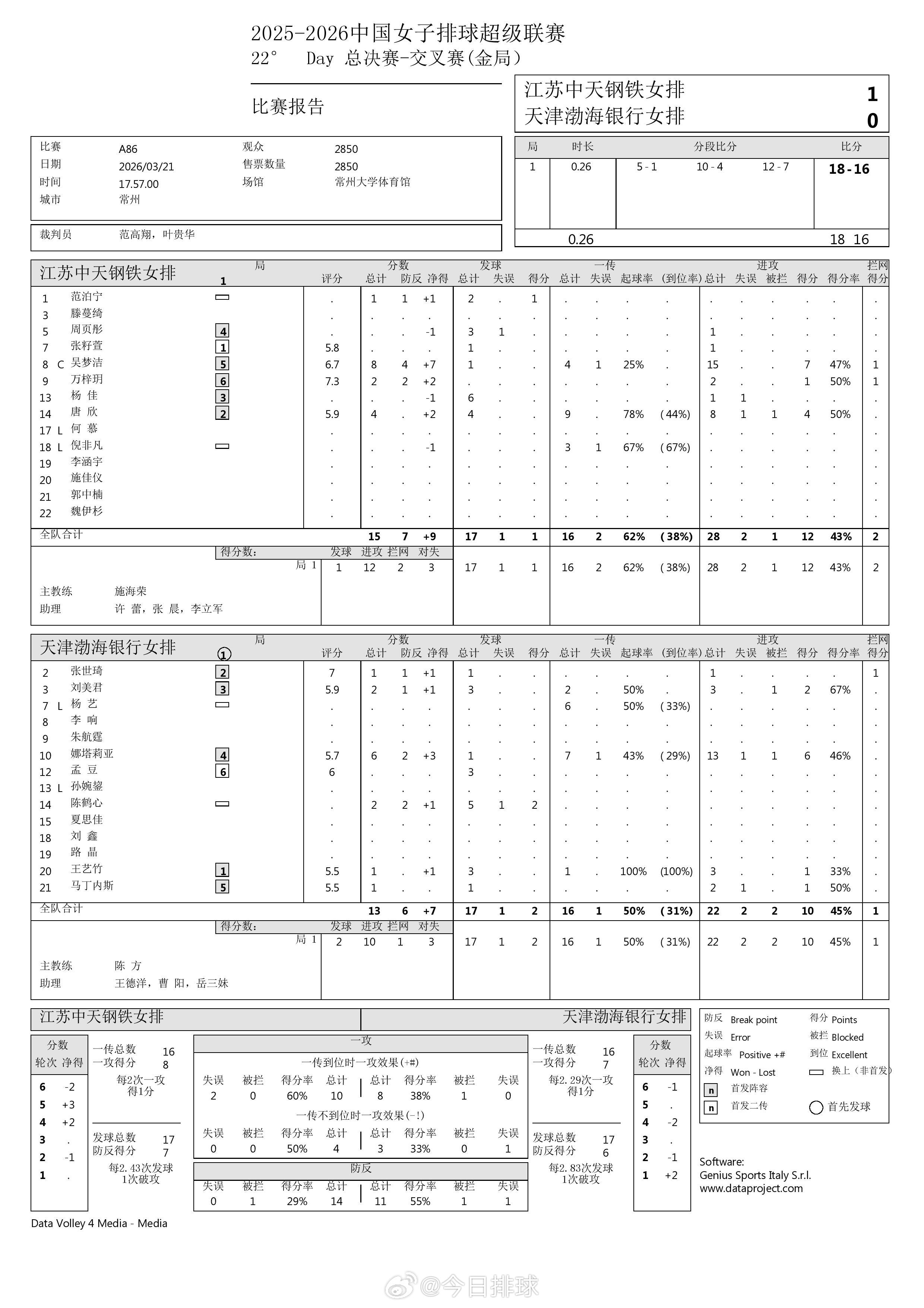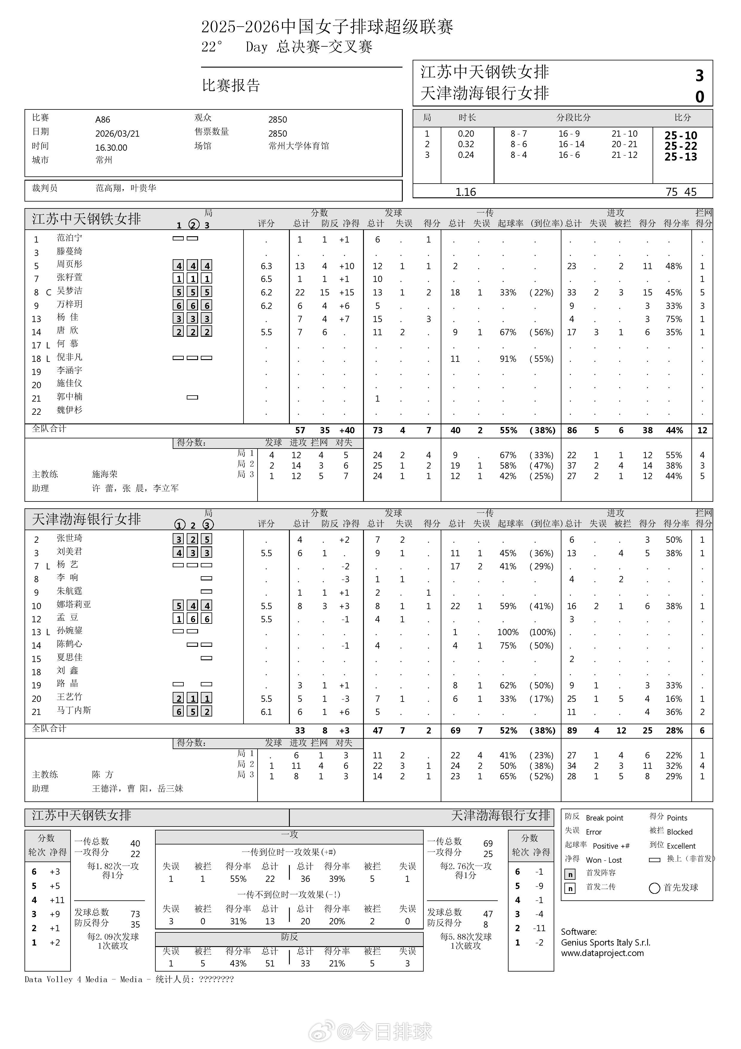 中国女排超级联赛 A级半决赛次回合江苏3-0天津、金局江苏1-0天津得分统计。