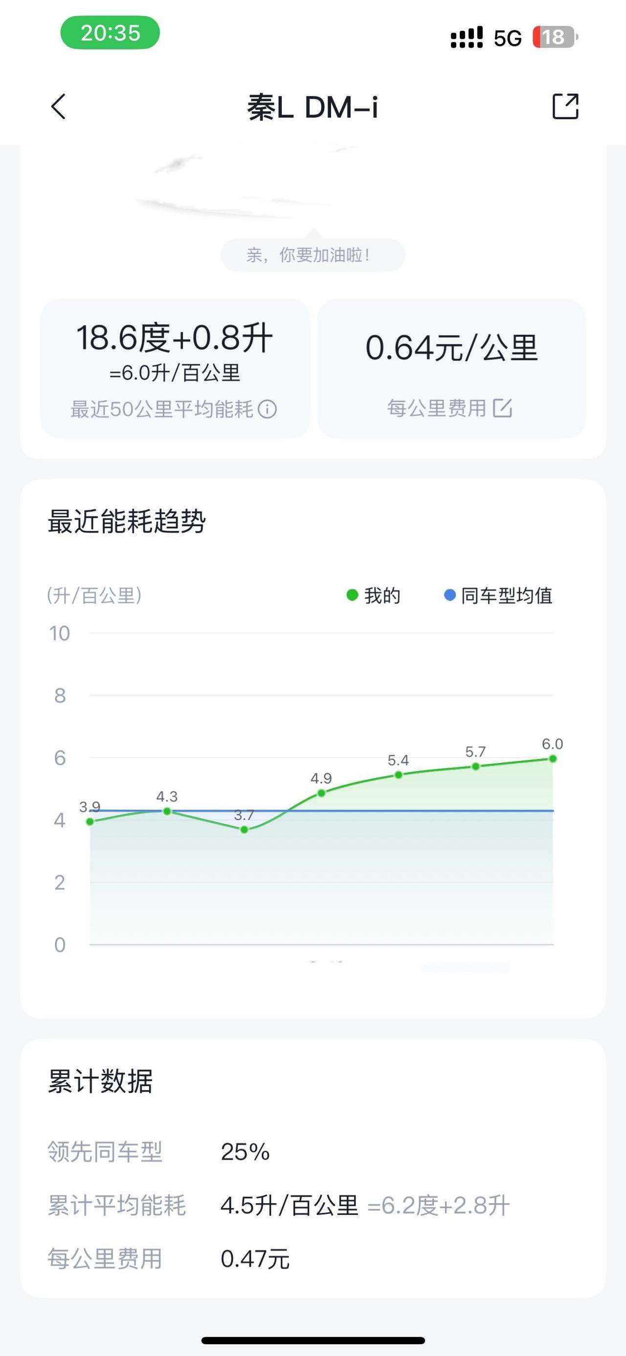 🚗秦L DM这波能耗属实有点上头了,表显18.6度+0.8升,折算6升/百公里,说明这车真不是只会省,开顺了也挺能打。日常通勤和代步压力不大,账面看着挺香。就是日常波动有点明显,也说明脚法、路况影响不小,稳定性还有得看。📉 个人数据,仅供参考。【来自懂车帝车友圈】