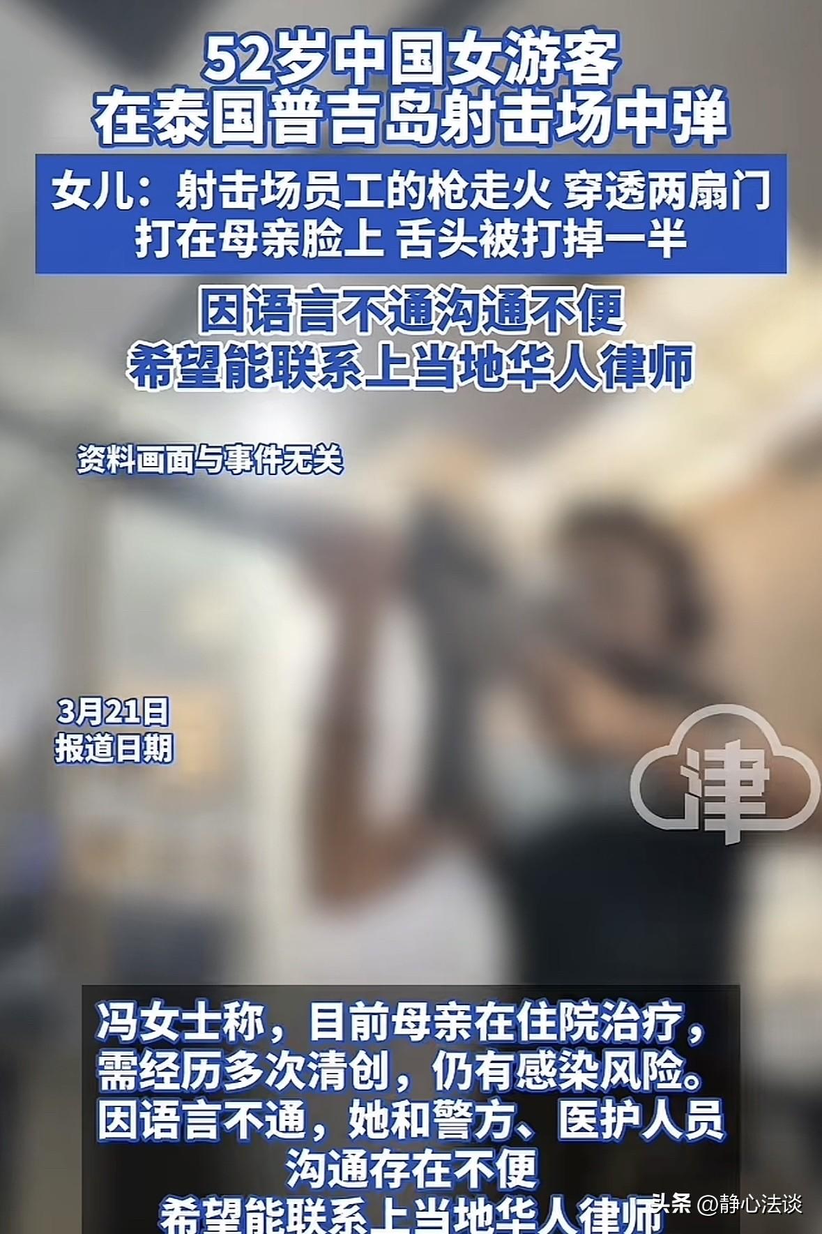 “乐极生悲!”一女子带52岁的妈妈出国旅游,通过司机介绍去了一家 射 击 场,结果遇到一员工子 弹走火,从休息室穿透2扇门,一下打到52岁母亲脸上,舌头都掉了一半,后来母亲被送到医院,被告知需要多次清创,但还是会有感染风险,女子身处异地,语言上的不通让她非常崩溃!网友:不幸中的万幸! 冯女士趁着不忙,带着52岁的妈妈去普吉岛游玩。 想让辛苦了大半辈子的妈妈看看海,吹吹风,好好享享福。 到了以后,司机介绍他们去了一家比较有名的射 击 场,冯女士就决定去体验一下。 妈妈年纪大,也是第一次见过,进去以后就在安全区拍照。 万万没想到,旁边休息室里的一个员工,突然 子 弹走火,穿透两扇门,一下打到了妈妈的脸上。 妈妈整个人直挺挺倒在地上,连疼都喊不出来,嘴里全是腥味,意识都模糊。 冯女士当时就疯了,她扑过去抱住妈妈,手都在抖。 眼泪混着妈妈脸上的血往下掉,可周围的工作人员凑过来叽叽喳喳说泰语,她一个字都听不懂。 她喊快叫救护车,快救救自己的妈妈,可跟前的人没一个能听懂的。 后来救护车来了,把人送到医院,可麻烦才刚刚开始。 医生告知,子 弹 穿透了脸颊,舌头打碎了一半,需要多次清创。 即便这样,感染的风险还是很高,具体能什么样全是未知数。 冯女士看着躺在异国病床上52岁的妈妈,眼泪噼里啪啦往下倒。 本来该在家跳广场舞,带孙子,现在脸肿得像发面馒头,连喝水都要靠管子,稍微动一下就疼得发抖。 冯女士守在床边,连哭都不敢大声。 后来警察来做笔录,她靠翻译软件一个词一个词地敲,连比划带猜。 想要表达自己母亲没有碰枪,是员工的走火了。 跟医生沟通治疗方案,也是一点点的翻译,生怕漏一个字,耽误了妈妈的治疗。 她想找射 击 场要说法,对方要么躲着不见,要么用正在调查搪塞,连一句道歉都没有。 那种绝望和无力感,让她无比崩溃。 后来冯女士四处寻找,公开求助,想找个当地华人律师,帮她讨个说法。 这事一出来,有人觉得太惨了,本来是享福的,现在变成这样,换谁都得崩溃。 不过语言不通应该是最绝望的吧,在外受这么大罪,连喊冤都没人听得懂,想想都窒息。 不过也有人后怕,这简直是不幸中的万幸,至少人还活着。 也有站着说话不腰疼的,家里不好玩吗?跑那么远出去玩这么危险的项目,现在出事知道害怕了。 对于我们这种打工人来说,这事永远不会发生,因为要在家里当牛马,没时间出去浪。 《涉外民事关系法律适用法》第44条:侵权责任,适用侵权行为地法律,当事人有共同经常居所地的,适用共同经常居所地法律,侵权行为发生后,当事人协议选择适用法律的,按协议。 冯女士是华人,常住国内,也可以申请按自己国法律,但泰国法院大概率认本地法。 因为是在外地受伤,理应按当地法律法规执行。  《民商法典》(泰国):经营场所(射击场)对所有进入者,负有法定安全保障义务。 也就是说只要你开门做生意,就得保证客人安全,不管员工是不是上班,地盘是你的,出事你就得担责。 其实谁出门旅游都是为了开心,谁也不愿意拿着自己和家人的平安去赌一场意外。 冯女士带妈妈出国,只是想尽一份孝心,让老人看看外面的世界,吹吹海边的风,拍几张好看的照片留个念想。 她没做错任何事,妈妈更没有,可偏偏就遇上了这种躲都躲不掉的祸事。 只希望冯女士能尽快找到靠谱的律师,能顺顺利利解决问题。 也希望所有在外旅游的家人,都能平平安安出去,安安全全回来。 对此,你怎么看这件事? @静心法谈 学法辨是非,慬法不到吃亏。