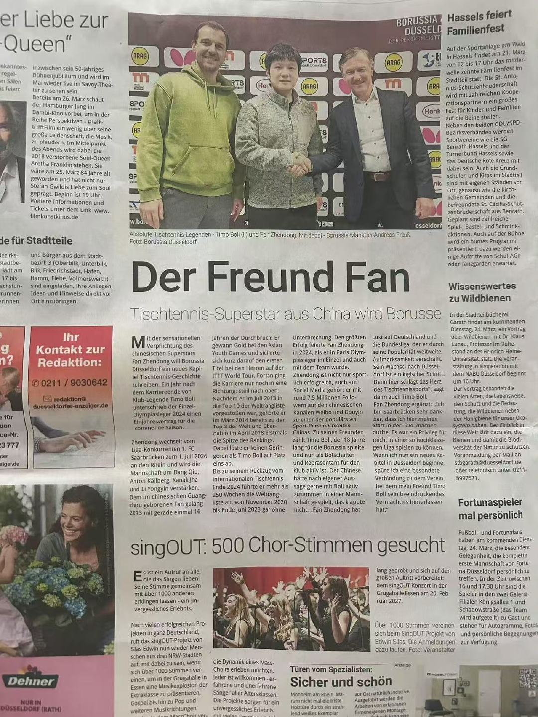 德国报纸头版报道樊振东加盟杜塞尔多夫,标题直接叫 “Fan 的球迷朋友”✨既是和波尔跨越赛场的挚友,也是带着暴力反手 + 中台碾压级相持的世界第一,用热爱和实力把中国乒乓的魅力带到欧洲,这才是体育最动人的模样。