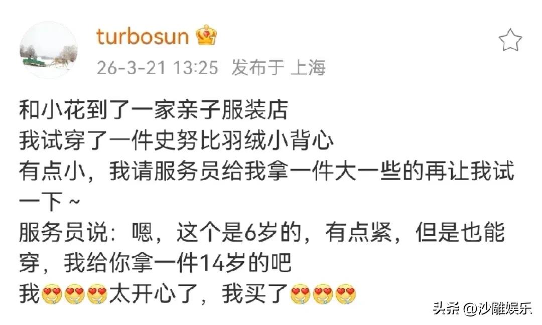 孙俪,太让人羡慕了! 3月21日,孙俪在社交平台高调发文,字里行间难掩兴奋,甚至带点“小得意”。原来,她带女儿小花逛童装店时,随手拿起一件史努比羽绒背心试穿,结果闹了个“乌龙”,却意外曝光了惊人身材! 画面中,孙俪刚套上背心就感觉偏紧,还自嘲“有点勒”,以为是大童款。结果店员一句话直接笑翻全场:“虽然有点紧,但这是6岁小朋友穿的尺码!”随后店员递上14岁尺码的同款,孙俪穿上后竟然刚刚好,还露出纤细腰肢,当场开心表示:“我太开心了,我买了!” 这波操作瞬间刷新了大家对“明星身材管理”的认知。要知道,孙俪可是娱乐圈出了名的自律代表,常年清淡饮食+规律运动,状态年轻到能驾驭童装,网友直呼:“娘娘这身材也太绝了吧!”“冻龄女神穿童装毫无违和感!” 不过,比起身材,更让人羡慕的是她和女儿的温馨互动。小花在一旁看着妈妈试衣服,母女俩的日常甜蜜溢出屏幕。从穿搭到亲子装,孙俪总能把生活里的小幸福描绘得特别动人。 说到这,不得不提孙俪的原生家庭。她曾因单亲家庭对父亲有怨恨,甚至一度是不婚主义,直到遇见邓超才改变想法。如今,她把童年的遗憾全部弥补给了孩子,亲手构建了自己梦想中的家。网友感叹:“她真的很会经营家庭,做她的孩子太幸福了!” 有人调侃:“孙俪这是把‘娘娘’的霸气用在了身材管理上。”也有人感慨:“从抗拒婚姻到幸福妈妈,她活成了自己最想要的样子。” 这次逛店花絮,不仅展现了孙俪接地气的一面,也让人看到她在生活中的柔软与可爱。或许,真正的“冻龄”不只是身材,更是那份懂得在平凡日子里找到幸福的能力。