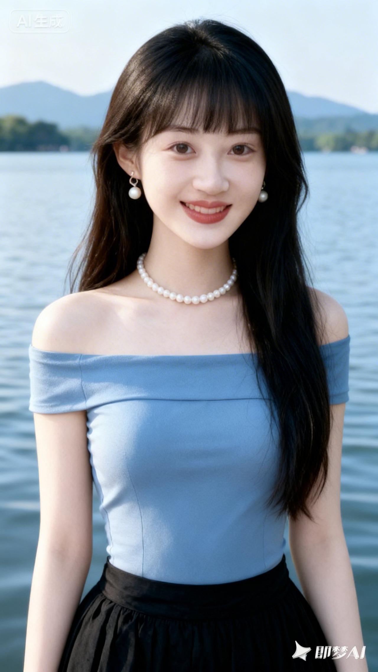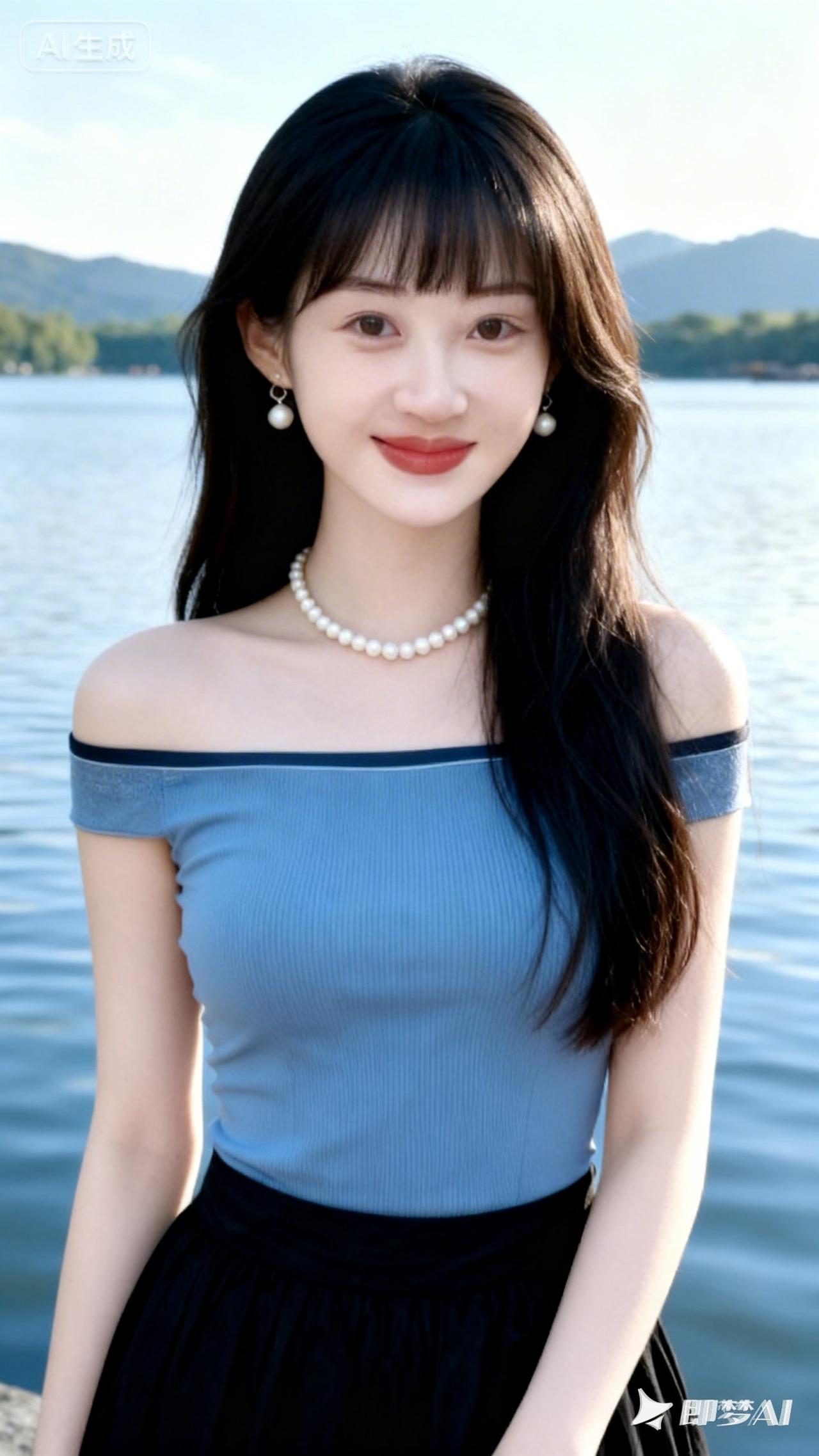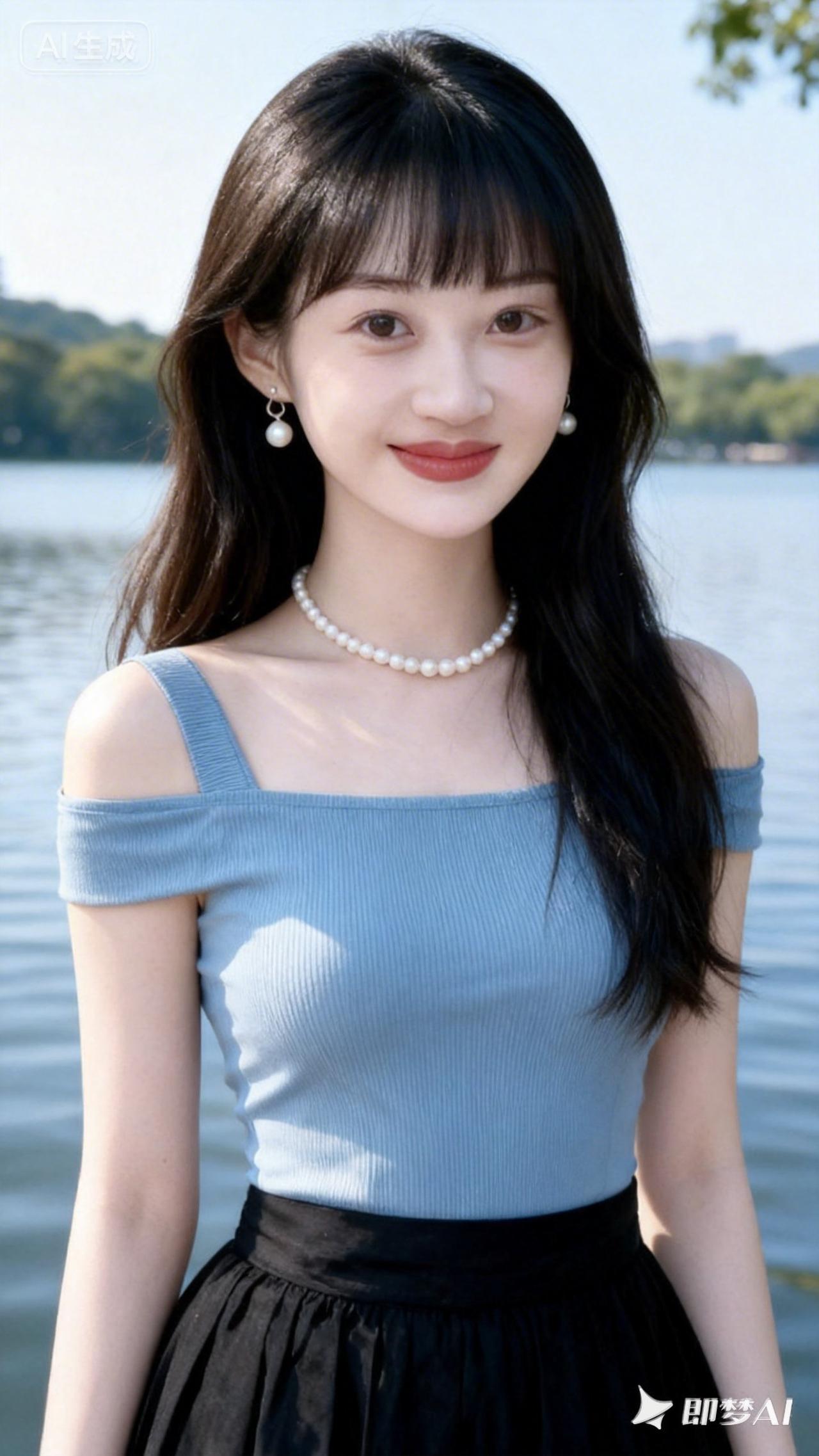 清新夏日穿搭,珍珠项链与湖畔的完美搭配