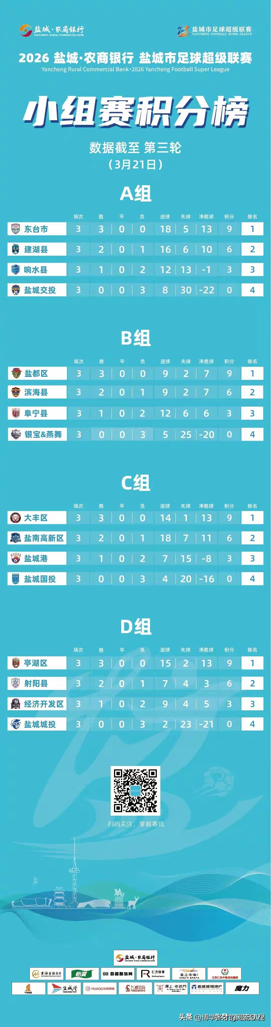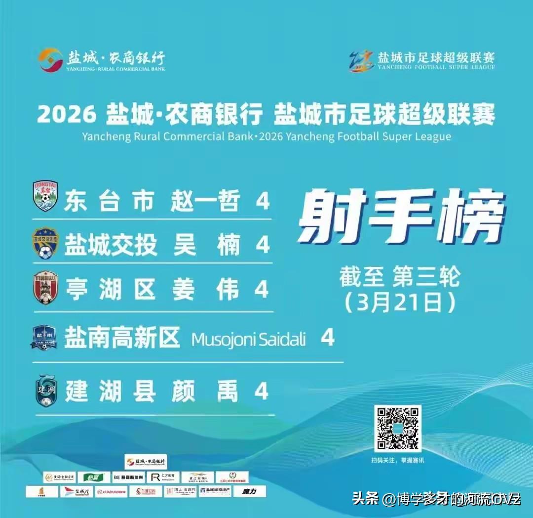 2026年盐城足球超级联赛,结束了第3轮比赛。 八强已经产生,图2是下一轮的对阵表。 图3是第3轮比赛的比赛结果。 图4是各个小组的积分表。 图5是射手榜。