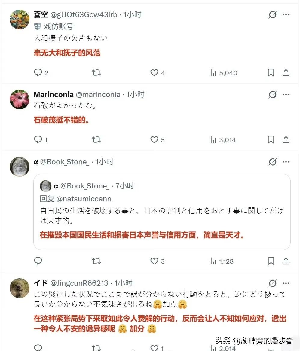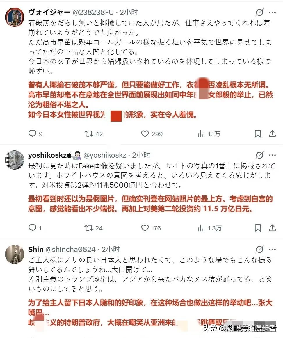 白宫刚放出这张“高市早苗在白宫欢呼”的照片,日本国内直接炸了锅。日本网友翻出石破茂当年被骂“衣着凌乱”的旧闻,冷笑着对比:“人家至少是为日本干活,她倒好,在美国人面前笑得像个跟班。” 照片里高市早苗神态夸张、笑容刻意,与国家首脑应有的庄重仪态反差明显,相关画面在日本网络快速发酵。网友的批评直指其外交姿态过于迎合,丢掉了国家领导人应有的立场与风骨。 石破茂当年因着装细节被舆论严苛审视,如今被旧事重提,更能看出日本民众对政治人物出访形象与行为的在意。民众期待的是为国家利益发声、保持外交独立的领导者,而非一味依附、姿态卑微的角色。 这场舆论风波,也折射出日本国内对过度追随外部势力的外交路线的普遍不满。普通民众更看重国家尊严与自主空间,反感将正式外交场合变成单方面迎合的表演,这也是日本社会对当前外交取向的朴素反馈。 各位读者你们怎么看?欢迎在评论区讨论。