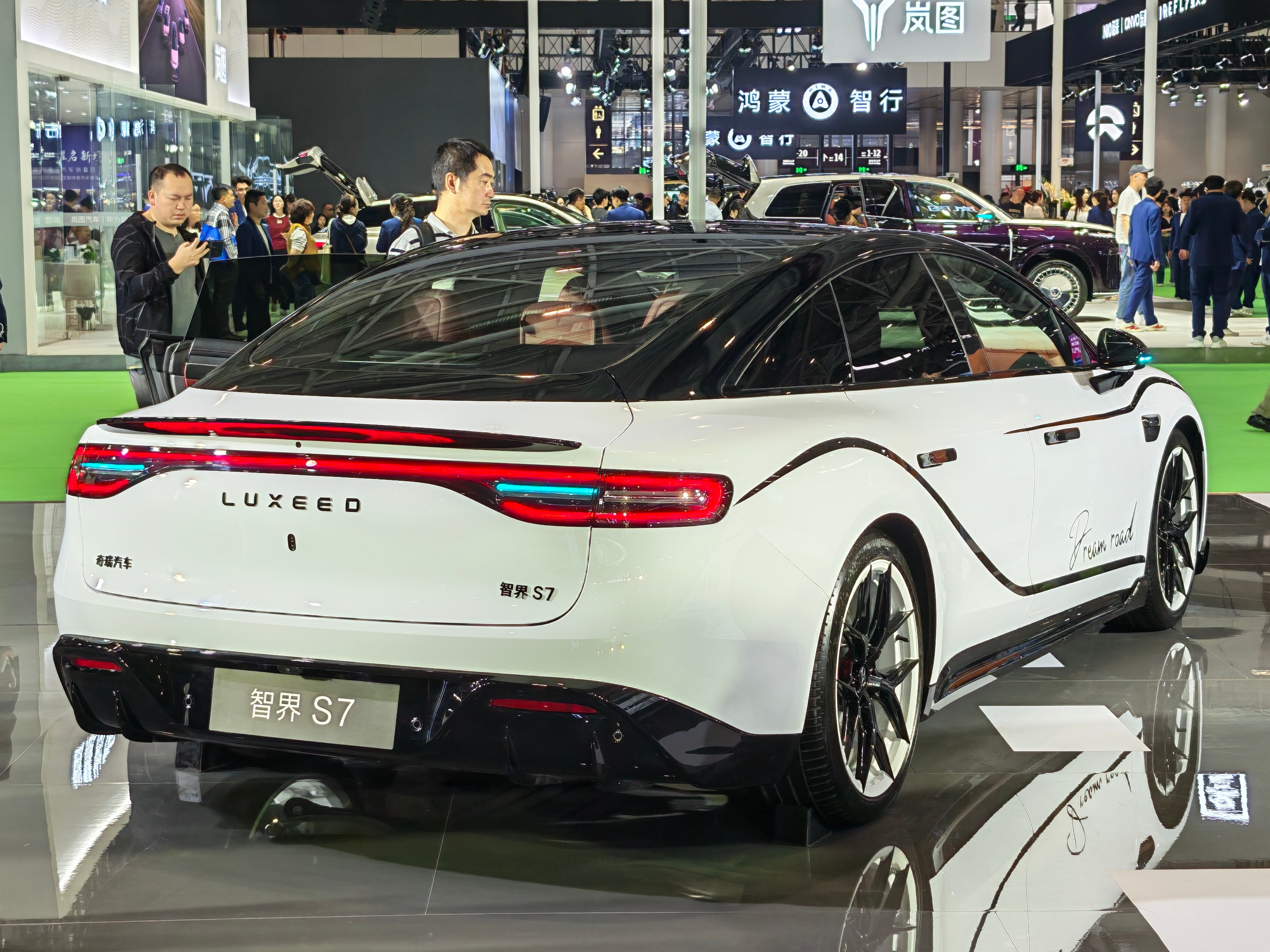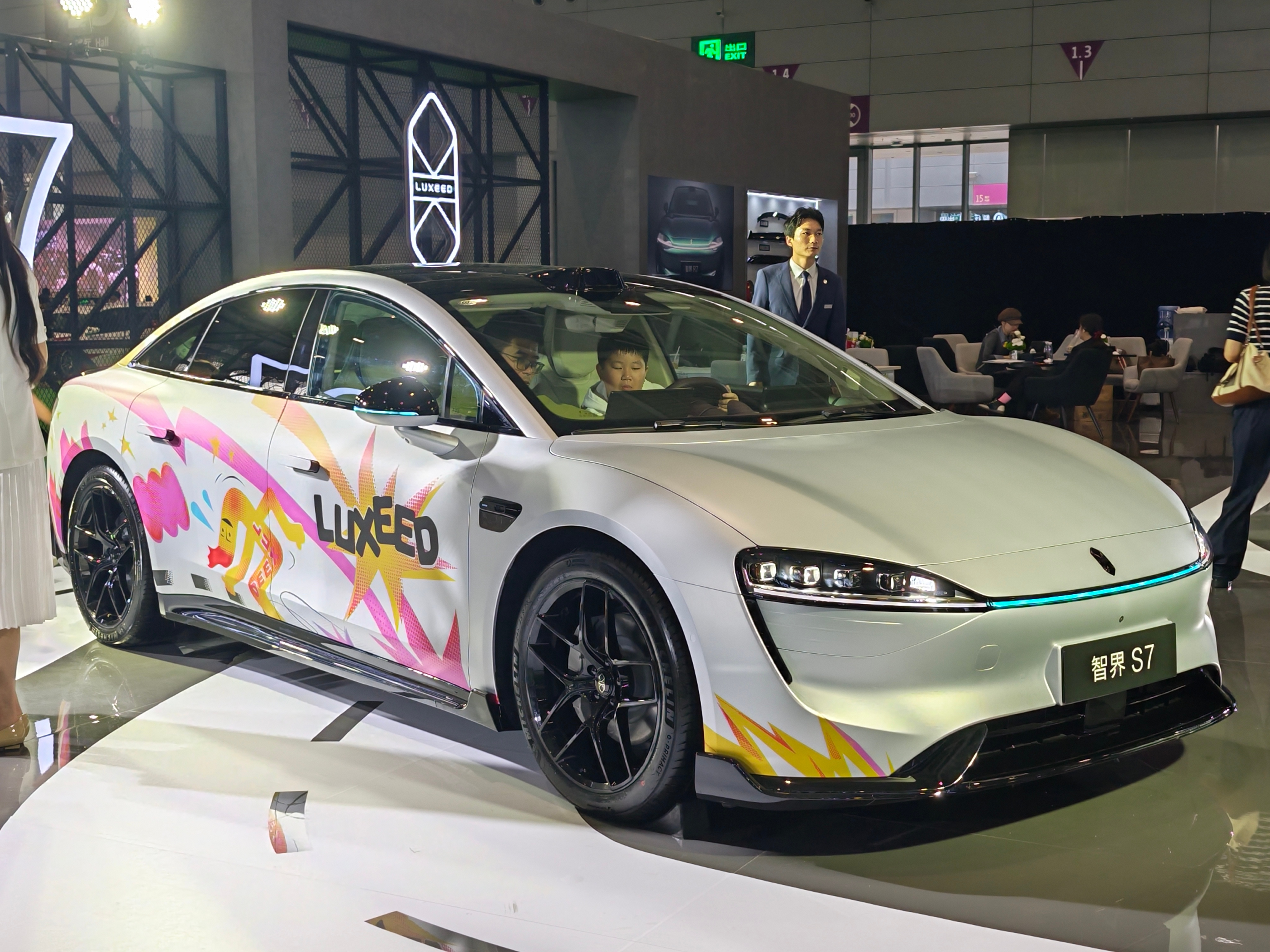 这次展台亮相的 S7 用原装的运动套件搭配拉花,简简单单的就凸显了运动感。R7 的表达更显高调,拉力风格的轮毂搭配斑马纹,赚足了观众的眼球。