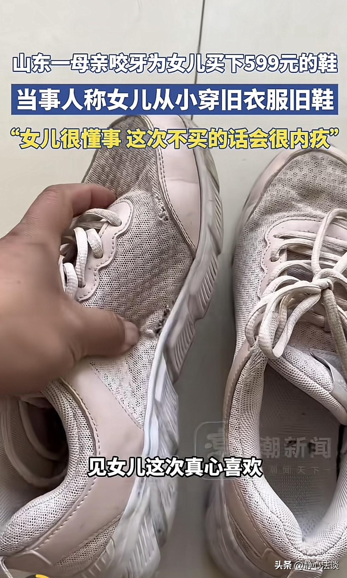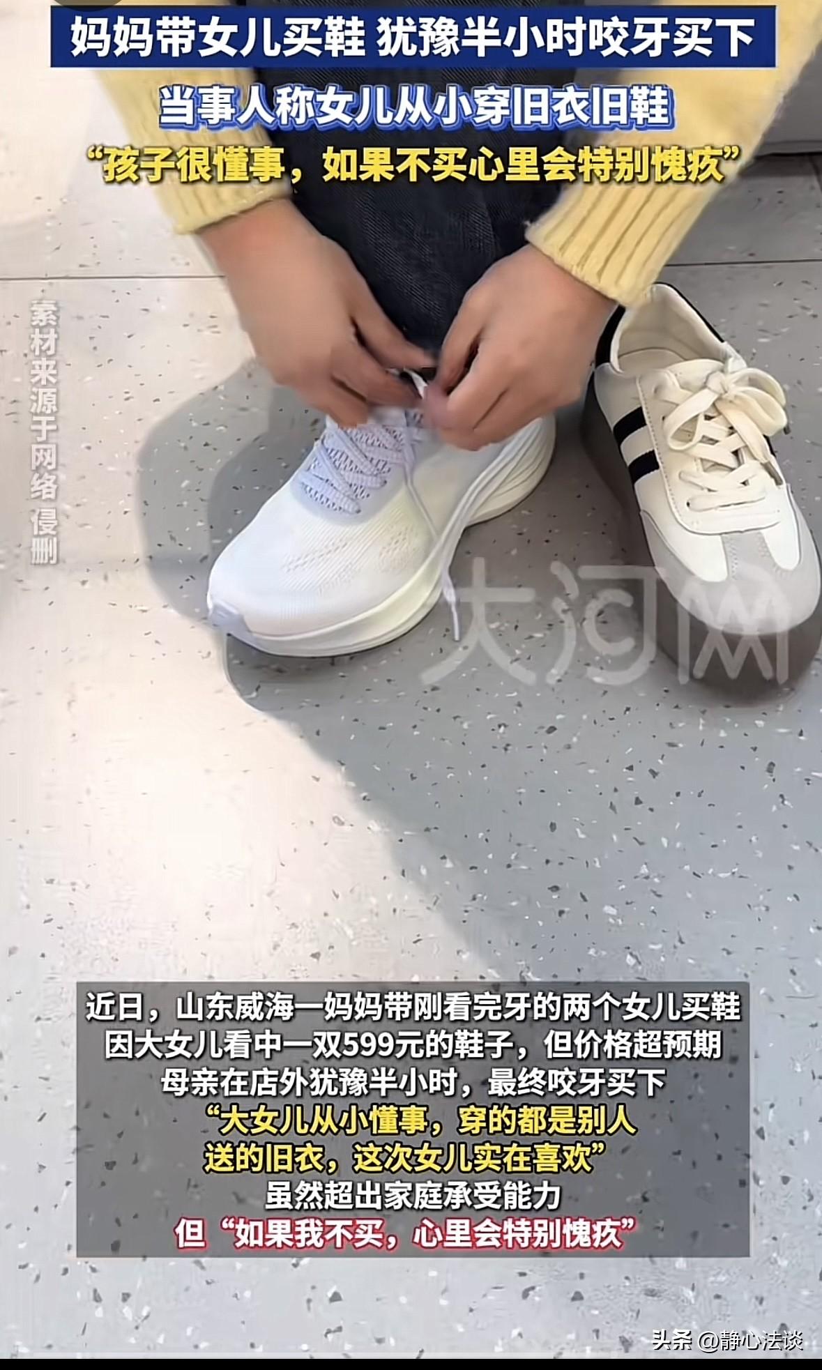 山东威海,一位妈妈带着2个女儿逛街买鞋,大女儿看上了一双599元的鞋,吵了预算,娘三在店门口纠结了半小时,随终还是咬牙把鞋买了,妈妈坦言,大女儿很懂事,从小就穿旧衣服旧鞋,这鞋女儿确实很喜欢,如果不买,自己一定会特别愧疚,她不想让懂事的女儿失望,网友:直到自己做了父母,才能明白这份藏在柴米油盐里的爱! 谁能想到,一双鞋能让一个妈妈在鞋店门口站了半小时。 手指攥着钱包反复捏紧又松开,最后还是咬牙付款,只因为不想让懂事的女儿失望。 起因是一位妈妈带着两个女儿逛街,想给两个孩子买双新鞋。 原本预算二百来块钱,结果逛到一家店,女儿一眼就看上了一双鞋。 一看价格傻眼了,要599元,女孩直接就把鞋放到架子上,拉着妈妈说不要了,再看看,可眼神里却藏不住的喜欢。 女儿拉起妈妈就走,妈妈出门后带着两个孩子坐在路边休息,妈妈问大女儿是不是很喜欢那双鞋,大女儿摇摇头说太贵了。 妈妈看着大女儿的模样,懂事得让人心疼。 她打小穿的衣服鞋子,要么是亲戚家孩子穿剩下的,要么是她趁打折捡漏的。 从来没有主动跟家里要过一件新东西,更别说这种很贵的鞋子。 妈妈看了看女儿扣着手指,眼里带着期待又藏着胆怯的模样,心里像被什么东西揪了一下,酸酸的。 她心里一遍遍劝自己,家里的水电燃气费,伙食费,孩子的辅导班费,哪里都要钱,每一分钱都要掰成两半花。 这599块,说多不多,说少也不少,够家里买好几天的菜,够给孩子买很多辅导资料。 心里的天平来回晃,一边是掰着手指算的生活账,一边是孩子眼里藏不住的欢喜。 她回头往店里看了一眼那双鞋,又看了看女儿,女儿见状,赶紧把眼神移开,装作不在意的样子。 妈妈一狠心,钱可以再赚,但我孩子的童年就这么几年,不能让孩子因为钱,连喜欢一双鞋子的愿望都要藏着掖着。 自己苦点累点没关系,省吃俭用点总能熬过去。 她拉着女儿转头回到店里,一咬牙花了599元把鞋买了。 女儿看着妈妈把鞋买了,眼里突然就有了不一样的光。 接过鞋子后,小心翼翼抱在怀里,跟她说:妈妈,谢谢你,我爱你。 走出鞋店,女儿一路都小心翼翼护着新鞋子,蹦蹦跳跳走在她身边,阳光洒在孩子的笑脸上,格外耀眼。 她看着女儿的背影,想起自己小时候,母亲也是这样,自己省吃俭用,却总能把最好的留给她。 后来这位妈妈说,要是这次不买,她怕是心里也会特别愧疚。 这句话,说出了多少普通父母的心声 其实大家都系这样,为人父母后,好像都学会了这样的双标。 对自己抠抠搜搜,一件衣服穿好几年,一顿饭能凑活就凑活,可对孩子,却总想把最好的都捧到他们面前。 哪怕自己咬牙扛着,哪怕超出自己的能力范围,也不忍心让孩子受一点委屈,不忍心看到孩子眼里的光熄灭。 想起小时候,我们也总盼着能有一件新衣服或者新玩具,父母嘴上说着家里还有,可转头却会在我们睡着后,悄悄把新东西放在床头。 那时候的我们,只知道开心,却不懂父母背后的付出,不懂那一件件新东西,是他们省吃俭用攒下来的心意。 直到自己当了父母,才明白这份藏在柴米油盐里的爱,有多沉重,又有多温暖。 有人说,这世上的普通父母,大抵都是如此吧。 我们没有大富大贵的家底,给不了孩子锦衣玉食的生活,可那份想把最好的都给孩子的心,从来都不比任何人少。 我们在生活的泥沼里拼命奔波,为了几两碎银操劳奔波,可只要看到孩子的笑容,所有的辛苦和疲惫,好像都烟消云散了。 半小时的纠结,不矫情,却是无数普通家庭最真实的生活写照。 我们都在为生活精打细算,却总在孩子面前,心甘情愿地破例。 因为孩子的快乐,永远比自己的省吃俭用更重要。 《民典法》第26条:父母对未成年子女负有抚养、教育和保护的义务。 妈妈买鞋是履行对未成年女儿的抚养,关爱义务,属于合法、自愿的监护行为。 599元虽超预算,但属父母自主决定的合理情感支出,妈妈买鞋是为满足女儿合理喜好,守护孩子童年快乐,符合有利于子女的原则。 @静心法谈 学法辨是非,慬法不到吃亏。