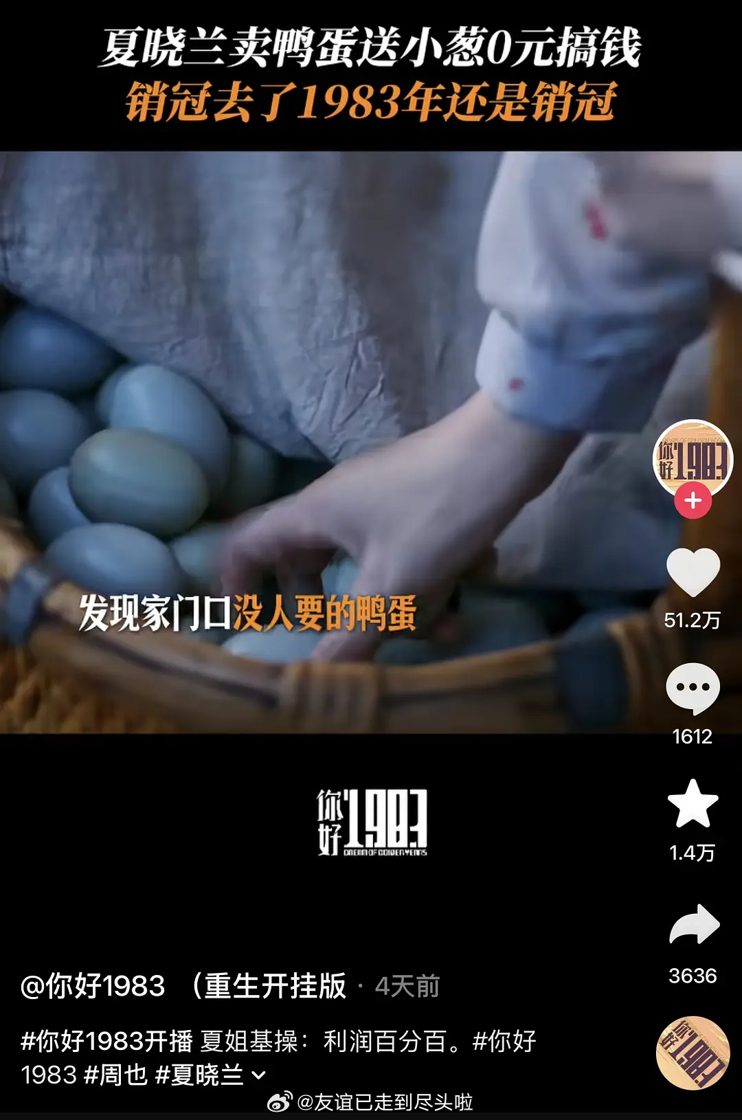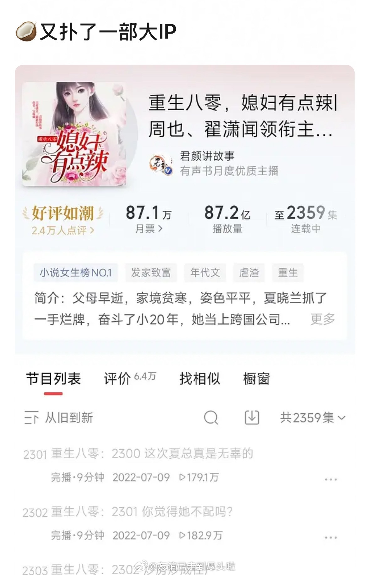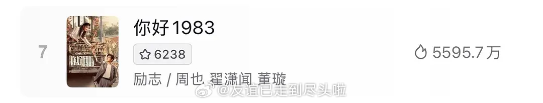 周也、翟潇闻的你好1983 现在成绩,对周也这种上升期的小花影响大吗?原书喜马拉雅八十多亿播放量的巨ip,百指走低,🫘热度第七,🍠至今未破亿,低位横盘没有口碑发酵的机会,打响集均1000保卫战