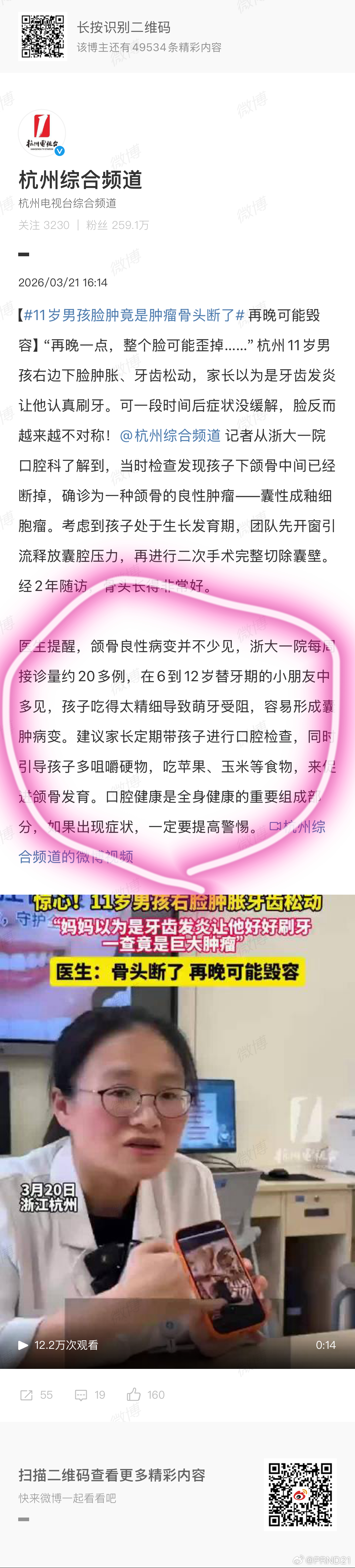 11岁男孩脸肿竟是肿瘤骨头断了 有两件事儿要说: