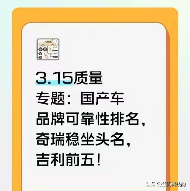 3.15质量专题:国产车可靠性榜单曝光,奇瑞登顶、吉利前五,合资车慌了! 奇瑞这次直接登顶,拿下自主第一,每百车故障数远低于行业平均,多年死磕发动机、底盘技术,终于用质量说话,不是靠营销堆出来的名气。吉利也稳坐前五,品控一直在线,家用车耐用、省心,销量和口碑双在线不是没道理。红旗、传祺、坦克等也集体发力,自主第一梯队越来越能打。 以前总有人说“合资闭眼买,自主看运气”,现在真该翻篇了。这份榜单不是偶然,是国产车十几年技术沉淀、品控升级的结果。三大件越来越稳,小毛病越来越少,不少车型已经超越二线合资,性价比直接拉满。 合资车以前靠品牌溢价躺着赚钱,现在自主从性价比卷到可靠性,再到智能化,全面追赶。那些还抱着老眼光、减配降价糊弄人的合资,真的坐不住了。 315看质量,国产车这次真的扬眉吐气,未来只会更卷、更强!大家觉得呢?
