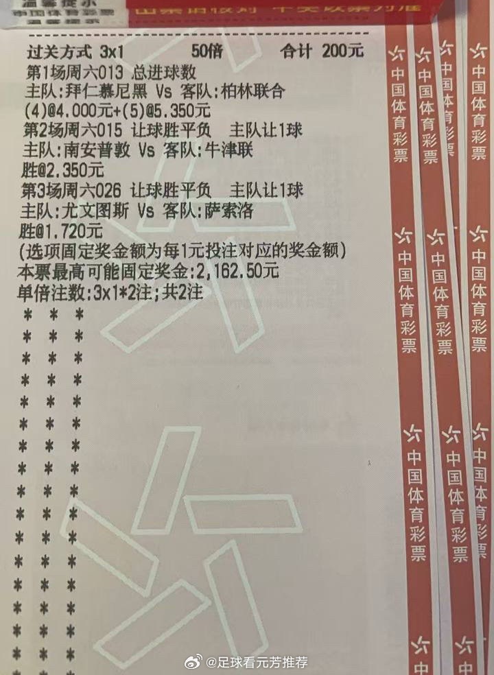 周期:013 德甲球队:拜仁vs柏林联合方向:4/5球数字:3-1 3-2 4-1—————————————————周期:015 英冠球队:南安普敦vs牛津联方向:让胜数字:2-0 3-0 3-1—————————————————周期:026 意甲球队:尤文图斯vs萨索洛方向:让胜数字:3-0 3-1 4-1