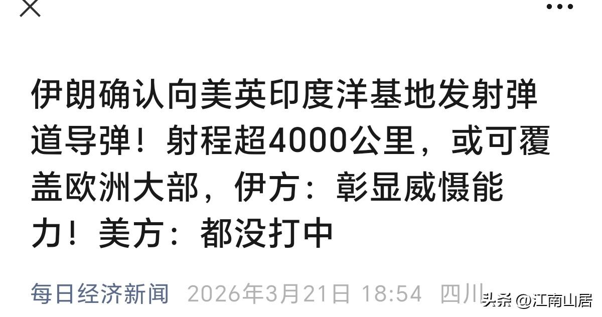 伊朗这次的威慑力有点大,导弹射程,居然突破了4000公里。该导弹射向了美英两国,在印度洋的军事基地。不论导弹有没有射中,这么远的距离,就足以起到一定的威慑力。 这对美国在印度洋、太平洋上的军事基地,以及欧洲各国都有着极大的威慑力。接下来,欧洲各国想要入场的话,也得考虑一下,本土是否能够接的住来自伊朗的导弹。 至于美伊双方,既然谁也奈何不了谁,谁也无法打败谁。那么战争打到这个份上,两国接下来,或许都应该想想,怎么停战了。 不过,估计短时间内,难以达成和解。就像俄乌战争还在持续一样。战争一旦真正的爆发,想要结束,就不是一件容易的事。