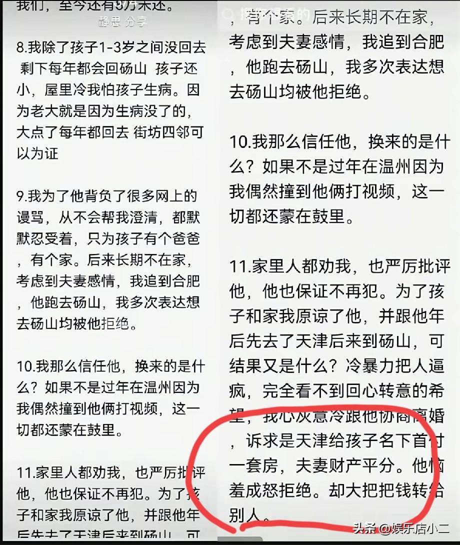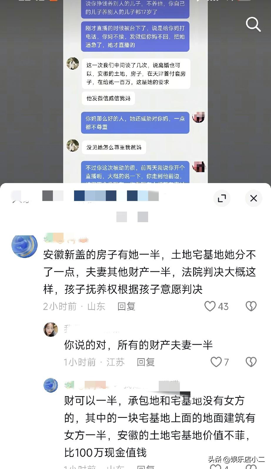 厉怀远曝光了林丽真实的离婚条件,实在是让人无法接受。 很多人都觉得厉怀远为什么任由林丽在网络上折腾?两人都没有私下协商吗? 厉怀远最明智的选择就是私下和林丽解决,不然不光可能断送他的直播事业,就是父母也会受到影响。 就在今天,有网友曝光的和厉怀远的聊天记录,就在事情发生后,李怀远和林丽谈了好几次。 林丽给出的最终条件是,安徽的土地,房子都给他,而且在天津首套一套房,并且另外给100万。 这怎么跟林丽说的不一样,她不是说就想给儿子买一套付首付房子,然后夫妻共同财产平分。 如果真跟厉怀远说的那样肯定没法接受,况且现在厉怀远还有外债,如果都给了她就一贫如洗了。 而且据网友透露,厉怀远安徽的地皮的宅基地没法转让,而且价值也远超100万。 有懂法律的网友说,应该是地上附属物的价值一人一半。 还有很多网友给厉怀远出主意。 有的说,既然资产分一半,外债也要分一半。 还有网友说,林丽一直打着孩子的名义要钱要房,那厉怀远把孩子的抚养权拿过来,看林丽还说什么?