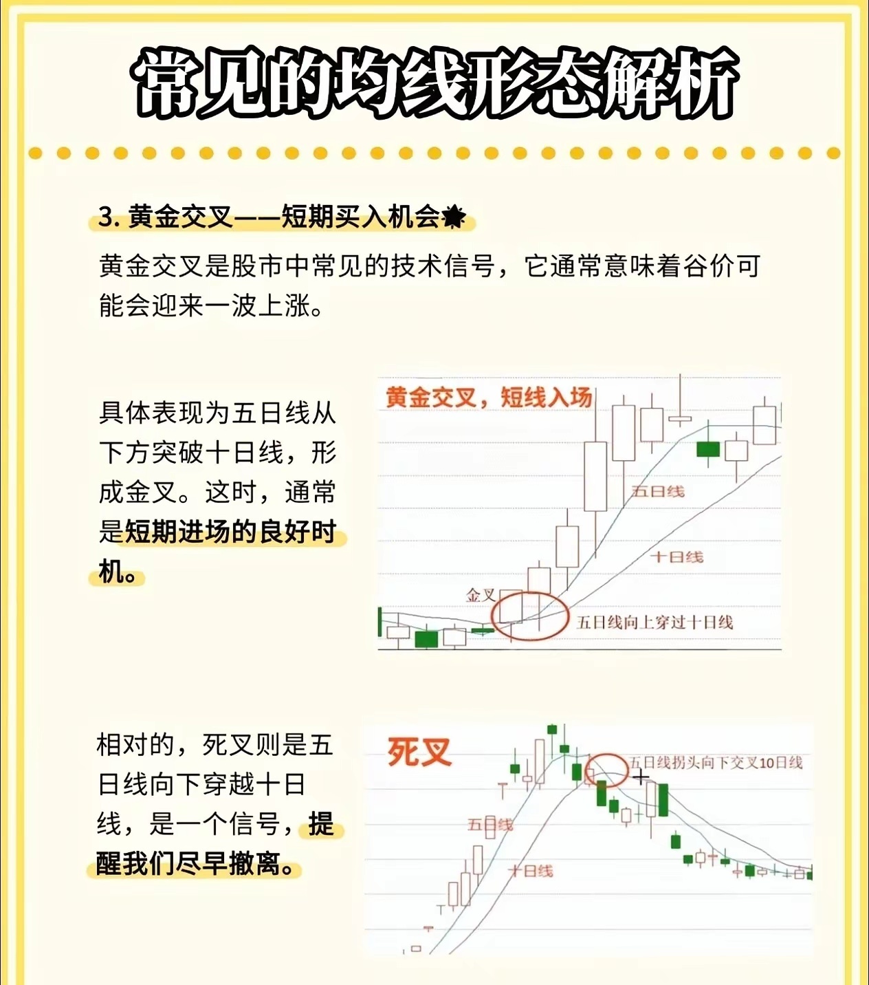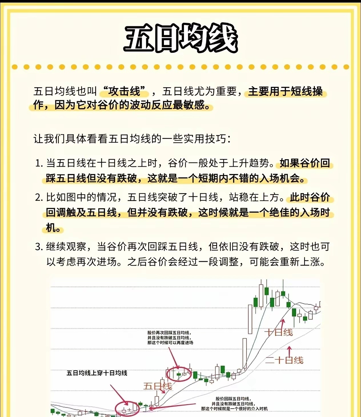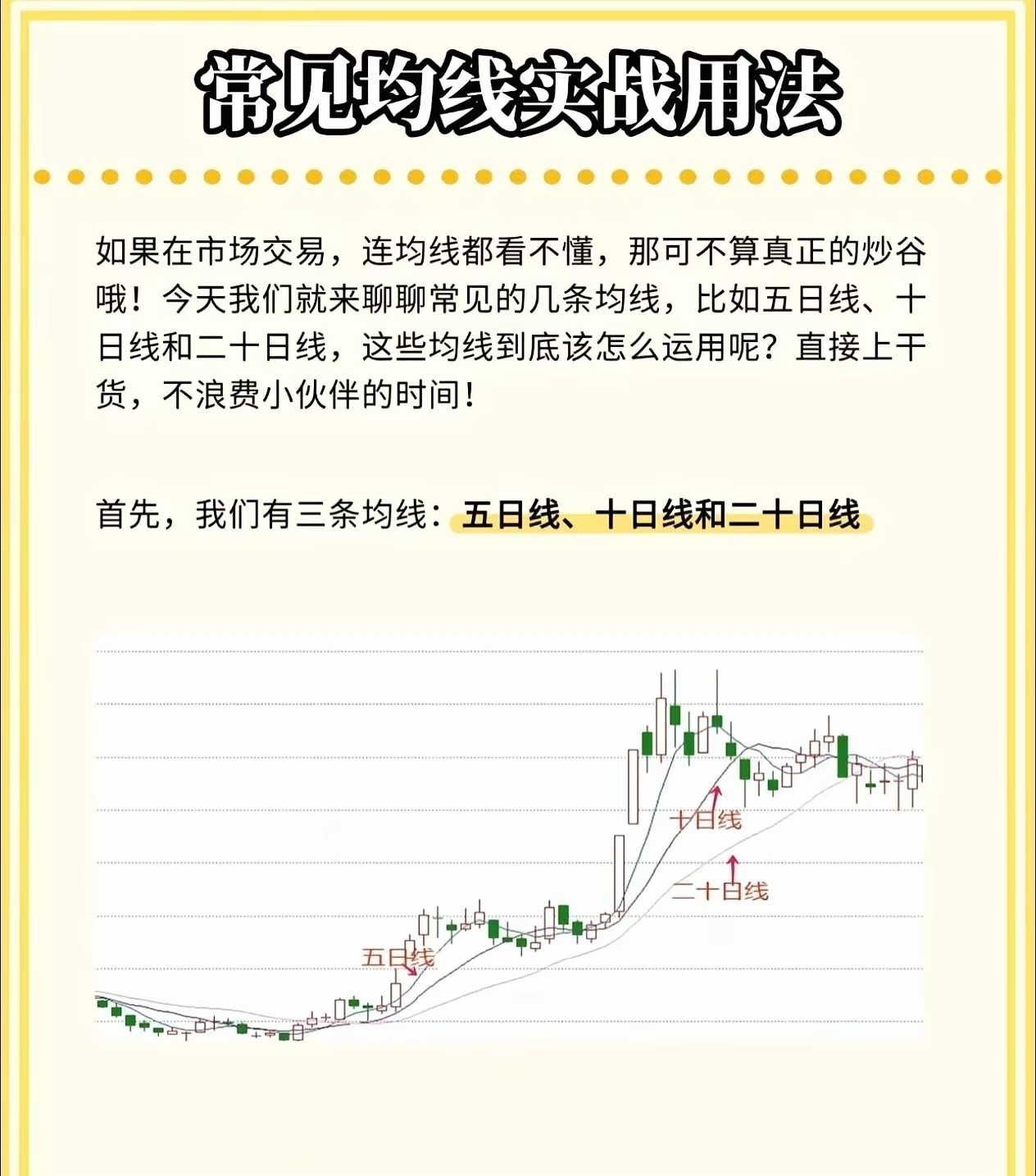股市小白必看!三条均线教你判断买卖点,简单实用!在股市里混,如果连均线都看不懂,那真的很难赚到钱。今天我就用最直白的话,给大家讲讲三条最常用的均线——五日线、十日线、二十日线的实战用法,学会了你也能轻松看懂趋势!🔥 五日均线——“攻击线”五日线对股价反应最灵敏,适合短线操作。五日线在十日线之上,说明股价处于上升趋势。如果股价回踩五日线但没有跌破,就是短线入场的好时机。口诀来了:五日线拐头向上,可进场;拐头向下,赶紧离场;股价跌破五日线,坚决不做多!🧭 十日均线——“风向标”十日均线通常是主力资金控制的关键线,股价上涨时,主力一般不会让它跌破。如果股价跌破十日均线,并且没有反弹迹象,就要警惕风险,短线投资者可以把它当作止损线来用。💪 二十日均线——“生命线”二十日线代表一个月的平均成本,支撑和阻力力度都很强。股价在二十日线上方,机会大于风险;一旦跌破二十日线,说明市场进入阶段性风险区,要果断离场,别犹豫!📈 均线形态一眼看透趋势多头排列:五日线 > 十日线 > 二十日线,依次向上发散,说明市场处于上涨趋势,长期看涨。空头排列:五日线 < 十日线 < 二十日线,依次向下发散,说明市场进入下行趋势,长期看跌。⚡ 黄金交叉与死亡交叉黄金交叉:五日线从下往上穿过十日线,是短线买入信号。死亡交叉:五日线从上往下穿过十日线,是卖出或离场信号。这三条均线虽然简单,但组合起来就是一套非常实用的交易系统。你不需要看懂所有复杂指标,先把这几条线搞明白,炒股就能少走很多弯路!💬 你平时用哪条均线最多?欢迎在评论区聊聊你的看法!