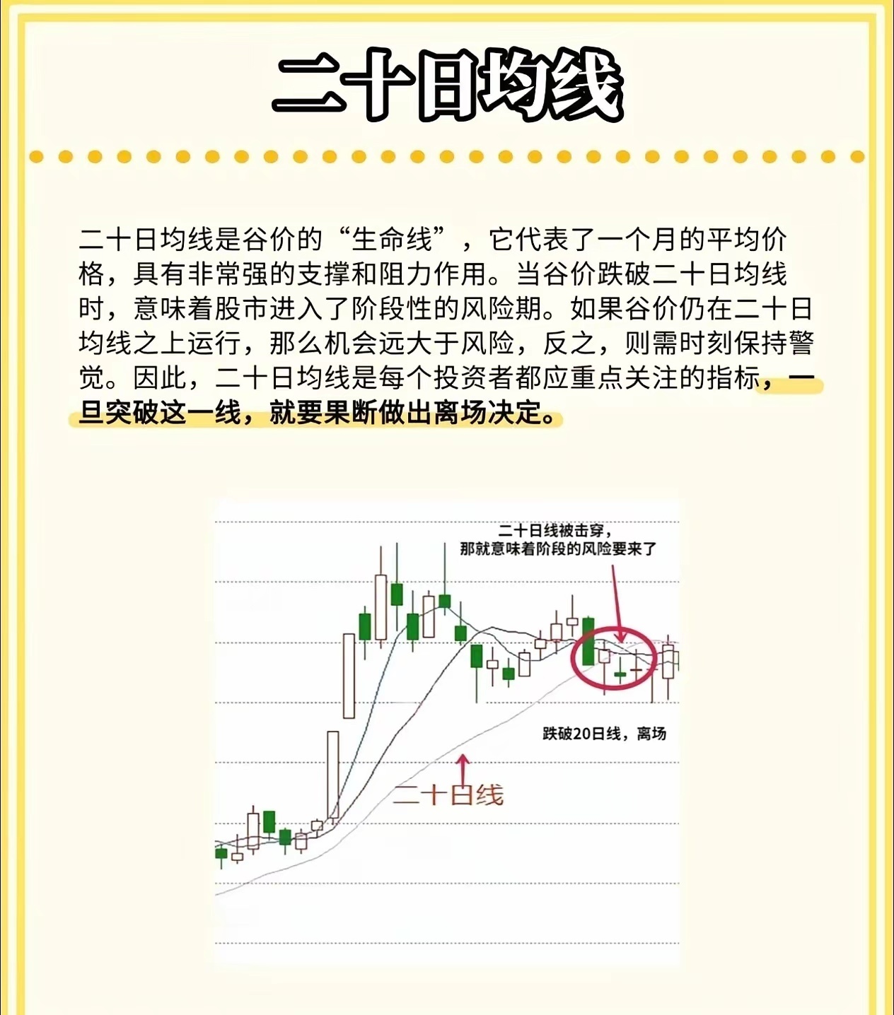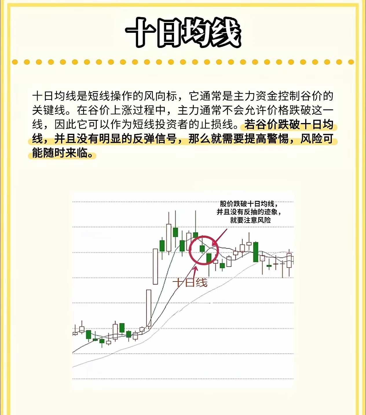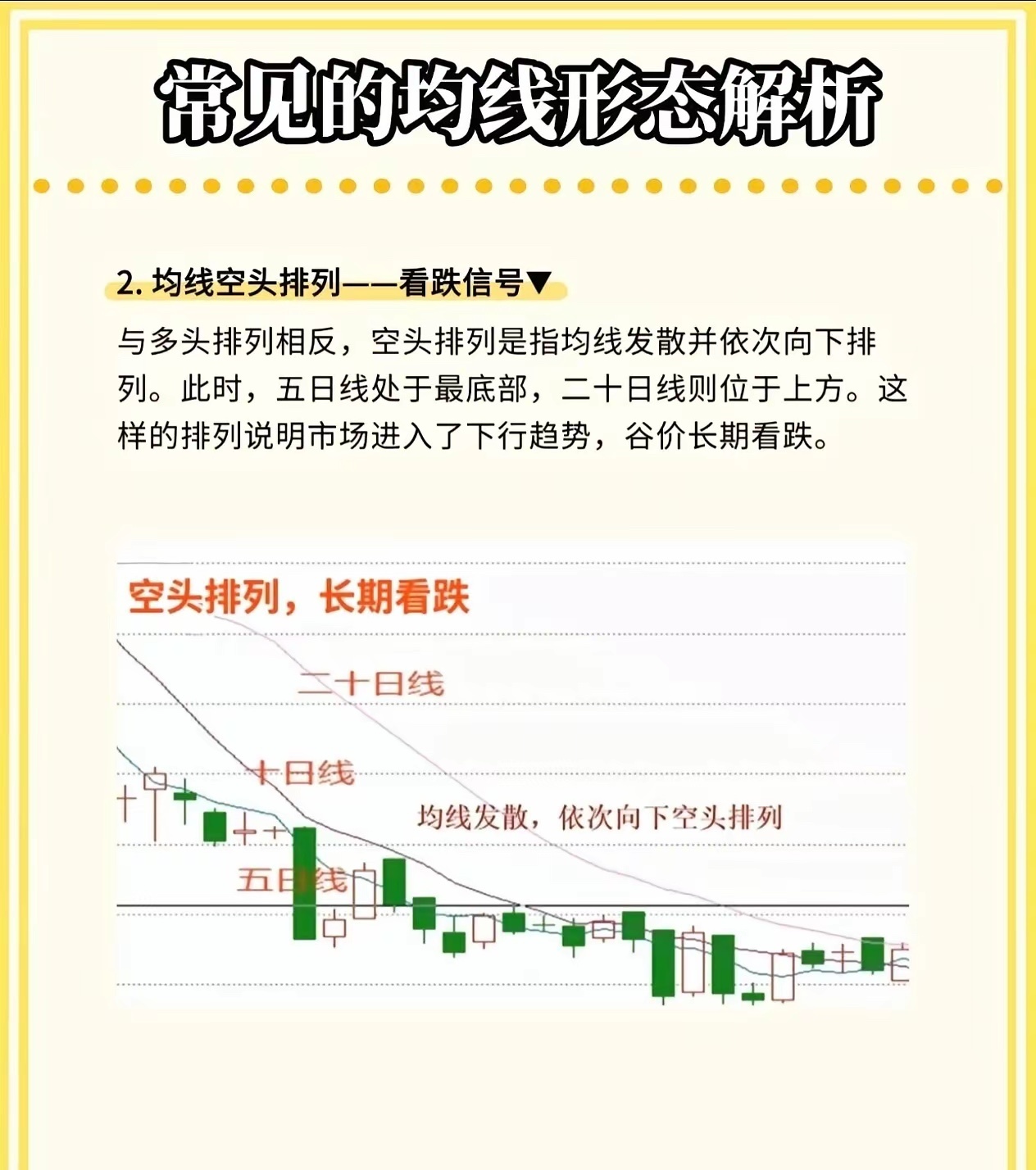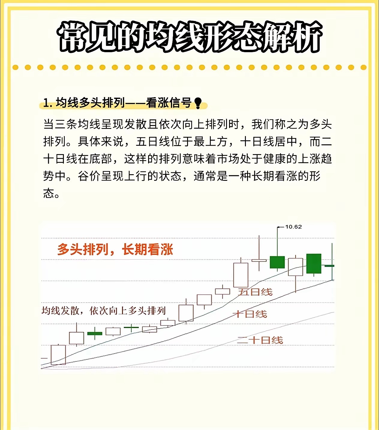 股市小白必看!三条均线教你判断买卖点,简单实用!在股市里混,如果连均线都看不懂,那真的很难赚到钱。今天我就用最直白的话,给大家讲讲三条最常用的均线——五日线、十日线、二十日线的实战用法,学会了你也能轻松看懂趋势!🔥 五日均线——“攻击线”五日线对股价反应最灵敏,适合短线操作。五日线在十日线之上,说明股价处于上升趋势。如果股价回踩五日线但没有跌破,就是短线入场的好时机。口诀来了:五日线拐头向上,可进场;拐头向下,赶紧离场;股价跌破五日线,坚决不做多!🧭 十日均线——“风向标”十日均线通常是主力资金控制的关键线,股价上涨时,主力一般不会让它跌破。如果股价跌破十日均线,并且没有反弹迹象,就要警惕风险,短线投资者可以把它当作止损线来用。💪 二十日均线——“生命线”二十日线代表一个月的平均成本,支撑和阻力力度都很强。股价在二十日线上方,机会大于风险;一旦跌破二十日线,说明市场进入阶段性风险区,要果断离场,别犹豫!📈 均线形态一眼看透趋势多头排列:五日线 > 十日线 > 二十日线,依次向上发散,说明市场处于上涨趋势,长期看涨。空头排列:五日线 < 十日线 < 二十日线,依次向下发散,说明市场进入下行趋势,长期看跌。⚡ 黄金交叉与死亡交叉黄金交叉:五日线从下往上穿过十日线,是短线买入信号。死亡交叉:五日线从上往下穿过十日线,是卖出或离场信号。这三条均线虽然简单,但组合起来就是一套非常实用的交易系统。你不需要看懂所有复杂指标,先把这几条线搞明白,炒股就能少走很多弯路!💬 你平时用哪条均线最多?欢迎在评论区聊聊你的看法!