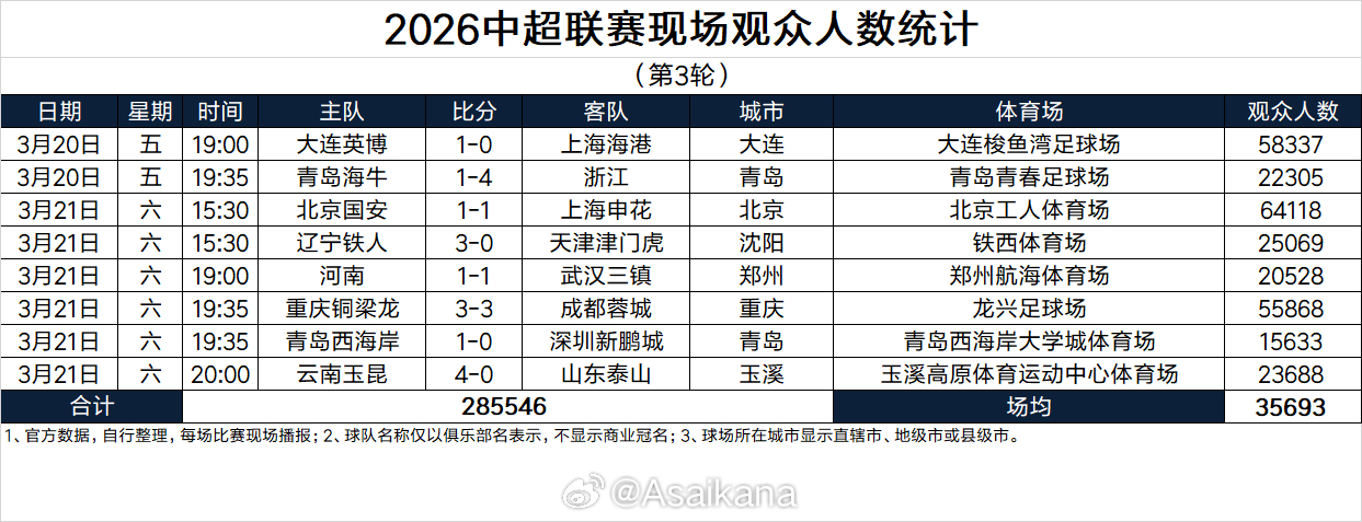 十年纪录,一朝打破!2026赛季中超联赛第3轮,8场比赛现场观众总人数高达285