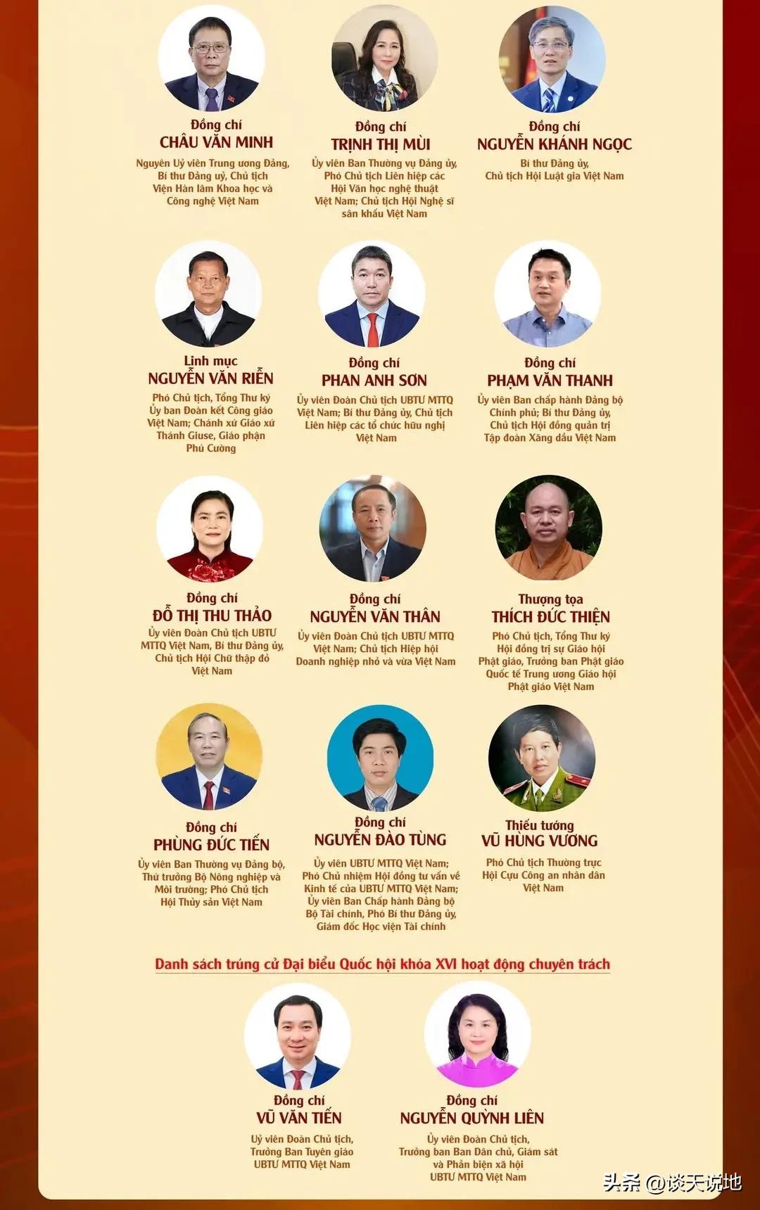 越南祖国阵线第十六届国会代表名单 🇻🇳 根据刚刚公布的名单,越南祖国阵线中央第十六届国会代表包括: 代表名单(1–18号) 1. 裴氏明怀女士:政治局委员、党中央书记、祖国阵线党团书记、中央各团体、越南祖国阵线中央委员会主席团主席,在富寿省第5选举单位当选第十六届国会代表。 2. 何氏娥女士:党中央委员、祖国阵线党团常务副书记、中央各团体、越南祖国阵线机关党团书记、越南祖国阵线中央委员会主席团副主席兼秘书长,在莱州省第1选举单位当选第十六届国会代表。 3. 阮泰学先生:祖国阵线党团副书记、中央各团体,在得莱省第1选举单位当选第十六届国会代表。 4. 梁国团先生:党中央委员、越南祖国阵线中央委员会主席团副主席、党团书记、越南农民协会主席,在安江省第2选举单位当选第十六届国会代表。 5. 裴光辉先生:党中央委员;祖国阵线党团常务委员会委员、中央各团体;越南祖国阵线中央委员会主席团副主席;党团书记、共青团中央第一书记;越南国家青年委员会主任,在嘉莱省第6选举单位当选第十六届国会代表。 6. 裴春长先生:越南祖国阵线中央委员会主席团副主席、党团书记、越南退伍军人协会主席,在高平省第1选举单位当选第十六届国会代表。 7. 阮英俊先生:党中央执行委员会委员、越南总工会主席,在岘港市第5选举单位当选第十六届国会代表。 8. 阮清平先生:越南祖国阵线中央委员会主席团团主席委员;越南老年人协会中央主席,在河静省第1选举单位当选第十六届国会代表。 9. 阮氏秋蓉女士:越南公共卫生协会副主席、兴安省公共卫生协会主席、太平医高专校长,在河内市第7选举单位当选第十六届国会代表。 10. 阮兰孝先生:第十五届国会代表、越南海外侨胞联络会副主席;副教授、博士,河内医科大学附属医院院长,在河内市第3选举单位当选第十六届国会代表。 11. 周文明先生:原党中央执行委员会委员、党团书记、越南科学技术翰林院主席,在富寿省第1选举单位当选第十六届国会代表。 12. 陈氏媚女士:党团常务委员会委员、越南文学艺术协会联合会副主席;越南讽刺艺术家协会主席,在同塔省第1选举单位当选第十六届国会代表。 13. 阮珏玉先生:党团书记、越南律师协会主席,在岘港市第4选举单位当选第十六届国会代表。 14. 阮文恋神父:第十五届国会代表、越南天主教团结委员会副主席兼秘书长;富圻教区圣朱塞佩堂区神父,在胡志明市第2选举单位当选第十六届国会代表。 15. 潘英山先生:越南祖国阵线中央委员会主席团团主席委员;党团书记、越南友好组织联合会主席,在乂安省第2选举单位当选第十六届国会代表。 16. 范文清先生:政府党团执行委员会委员、党团书记、越南石油集团董事会主席,在胡志明市第10选举单位当选第十六届国会代表。 17. 杜氏秋草女士:越南祖国阵线中央委员会主席团团主席委员、党团书记、越南红十字会主席,在同塔省第2选举单位当选第十六届国会代表。 18. 阮文仁先生:越南祖国阵线中央委员会主席团团主席委员;越南中小企业协会主席,在胡志明市第11选举单位当选第十六届国会代表。