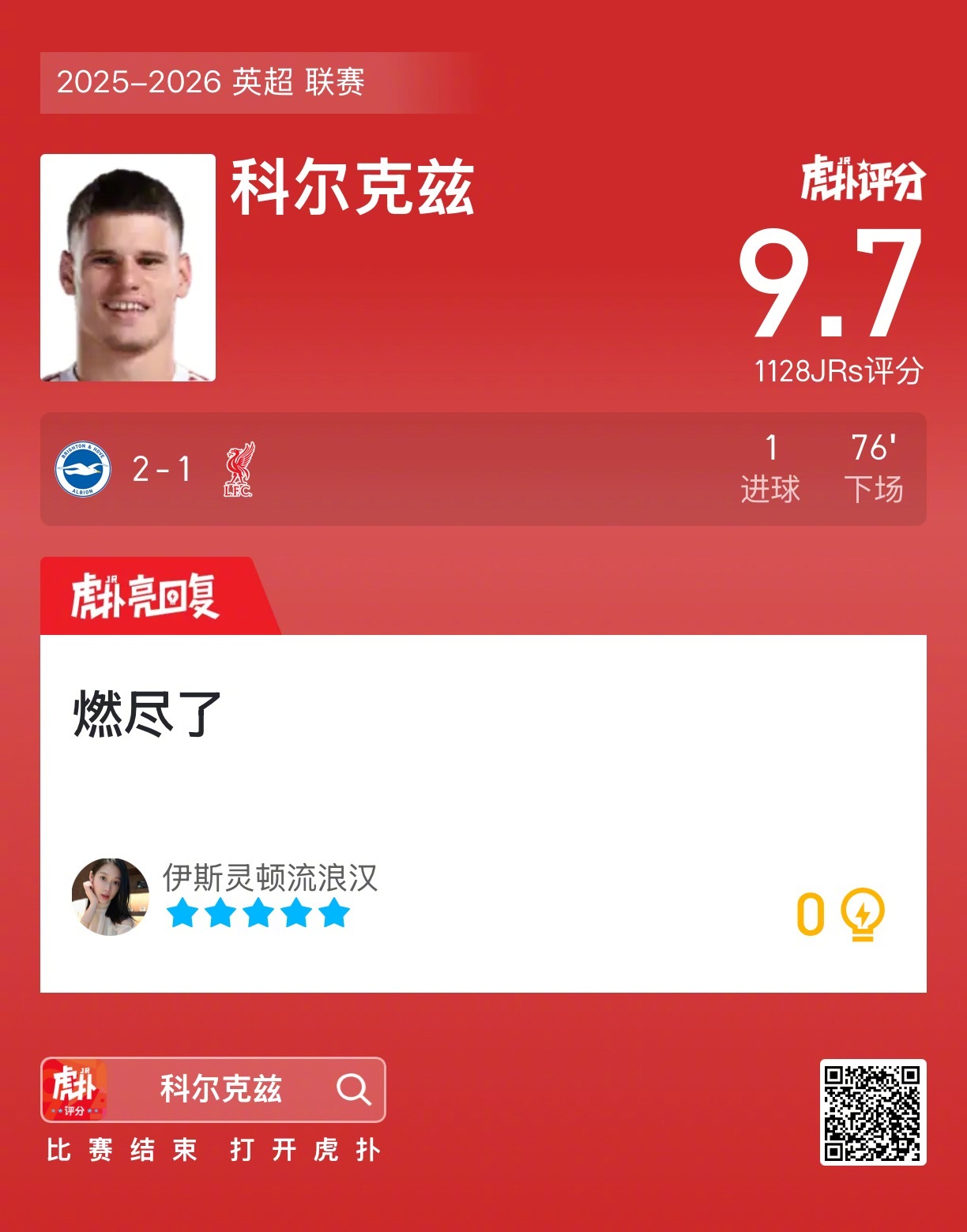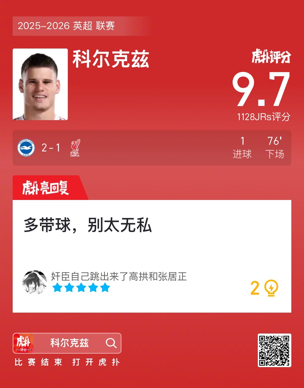 布莱顿2比1利物浦科尔克兹打进一球,这表现给几分?