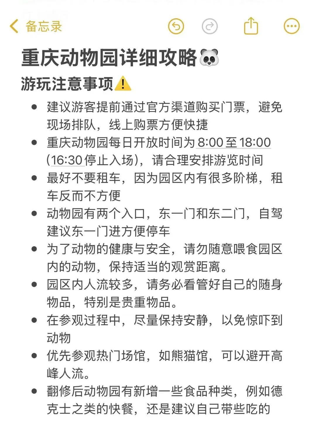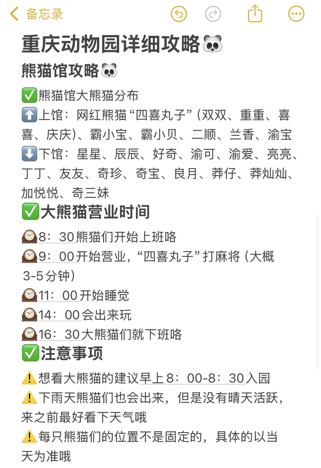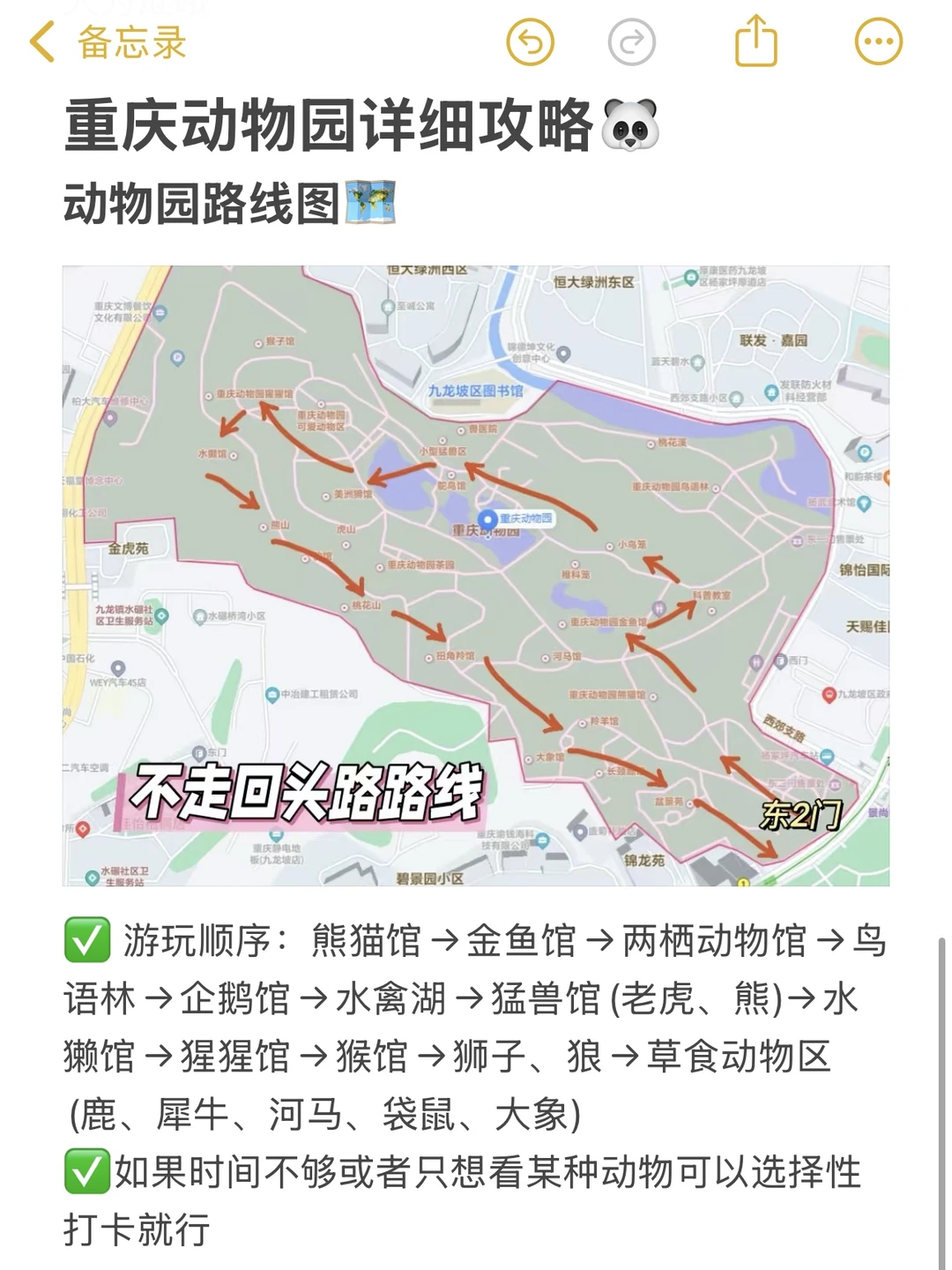 🗺 游玩路线要规划:熊猫馆→金鱼馆→两栖动物馆→鸟语林→企鹅馆→水禽湖→猛兽馆(老虎、熊)→水獭馆→猩猩馆→猴馆→狮子、狼→草食动物区(鹿、犀牛、河马、袋鼠、大象)