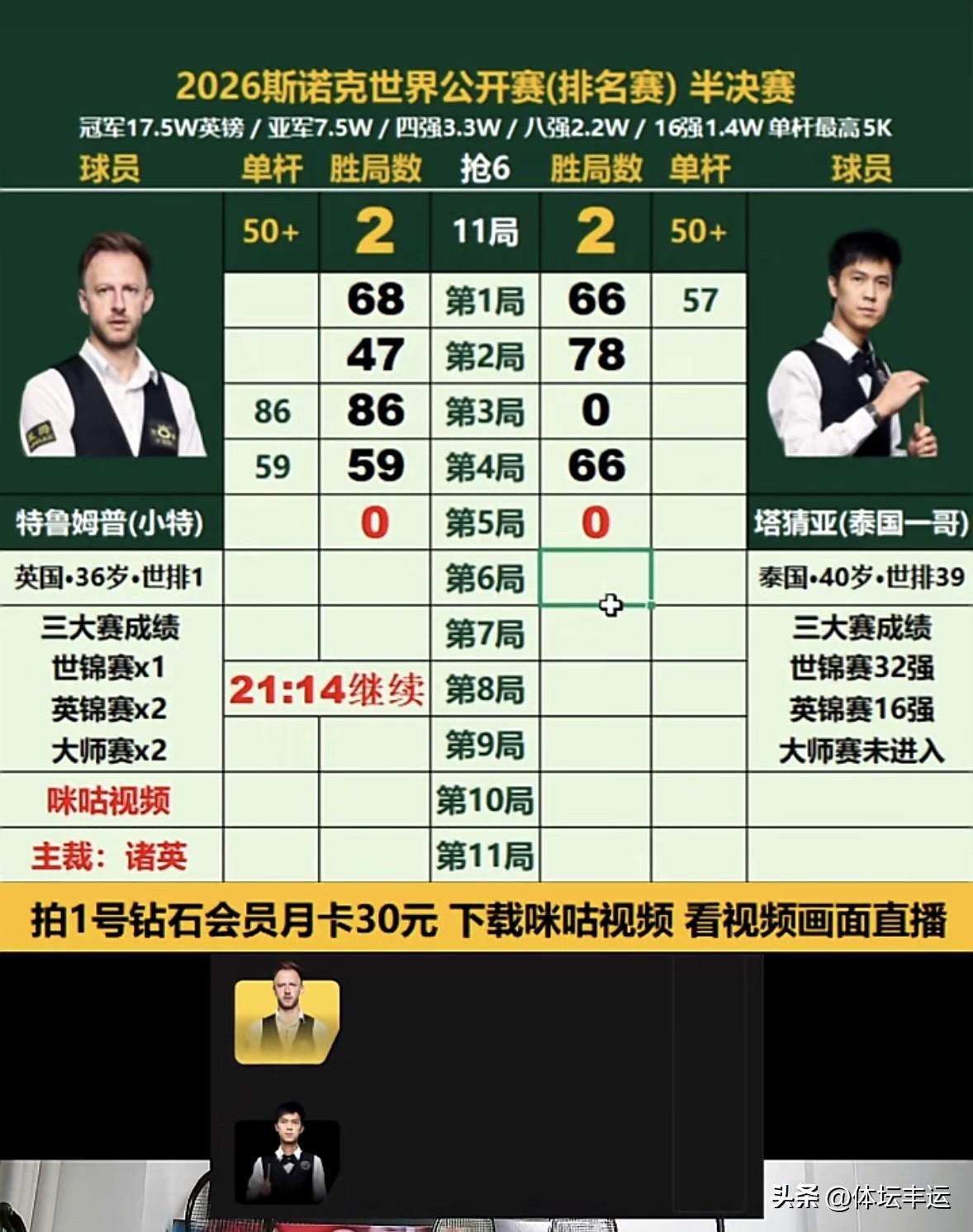 快讯,🔥🔥第一场半决赛:奥沙利文双赛点绝杀吴宜泽率先晋级决赛!🔥🔥第二场半决赛:特鲁姆普2-2战平塔猜亚进入中场休息😴 目前这场特鲁姆普与塔猜亚的较量备受关注。从已进行的4局比赛来看,双方状态都十分出色,你来我往互不相让。特鲁姆普作为斯诺克界的顶尖选手,进攻犀利且具有很强的掌控比赛节奏的能力。而塔猜亚也是一位实力强劲的选手,他的击球风格沉稳,在关键时刻也从不手软。 中场休息过后,比赛将会更加激烈。特鲁姆普肯定会调整策略,加强进攻的同时,注重防守的严密性,争取在后续的比赛中拉开比分。塔猜亚也不会轻易让步,他会继续保持自己的节奏,寻找特鲁姆普的防守漏洞,伺机得分。究竟谁能在这场半决赛中笑到最后,成功与奥沙利文会师决赛,让我们拭目以待!