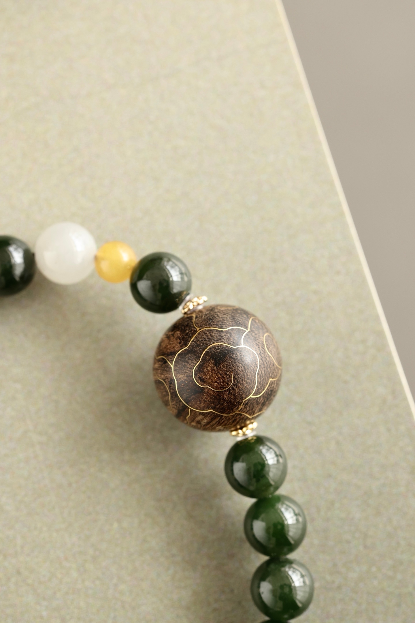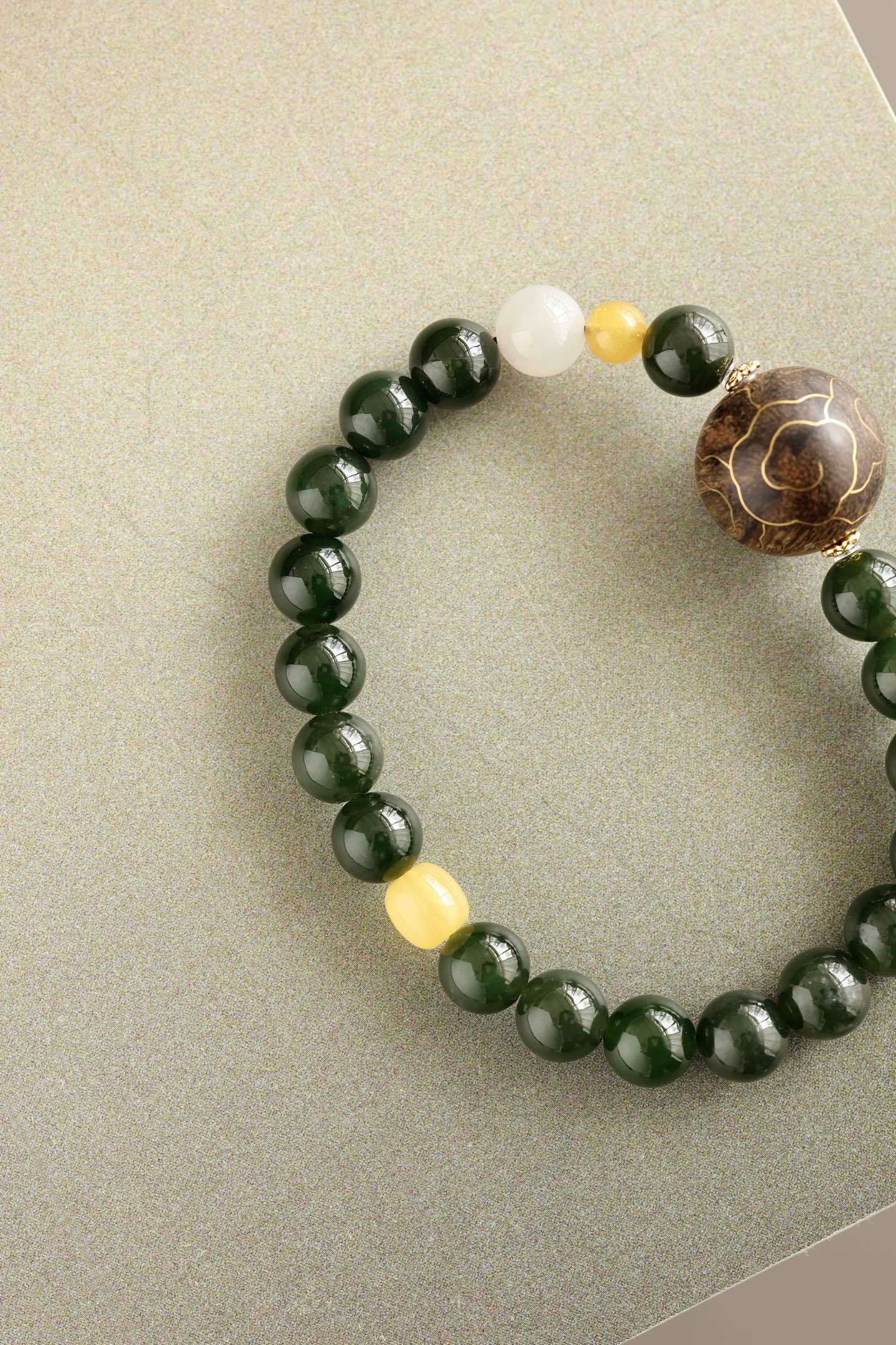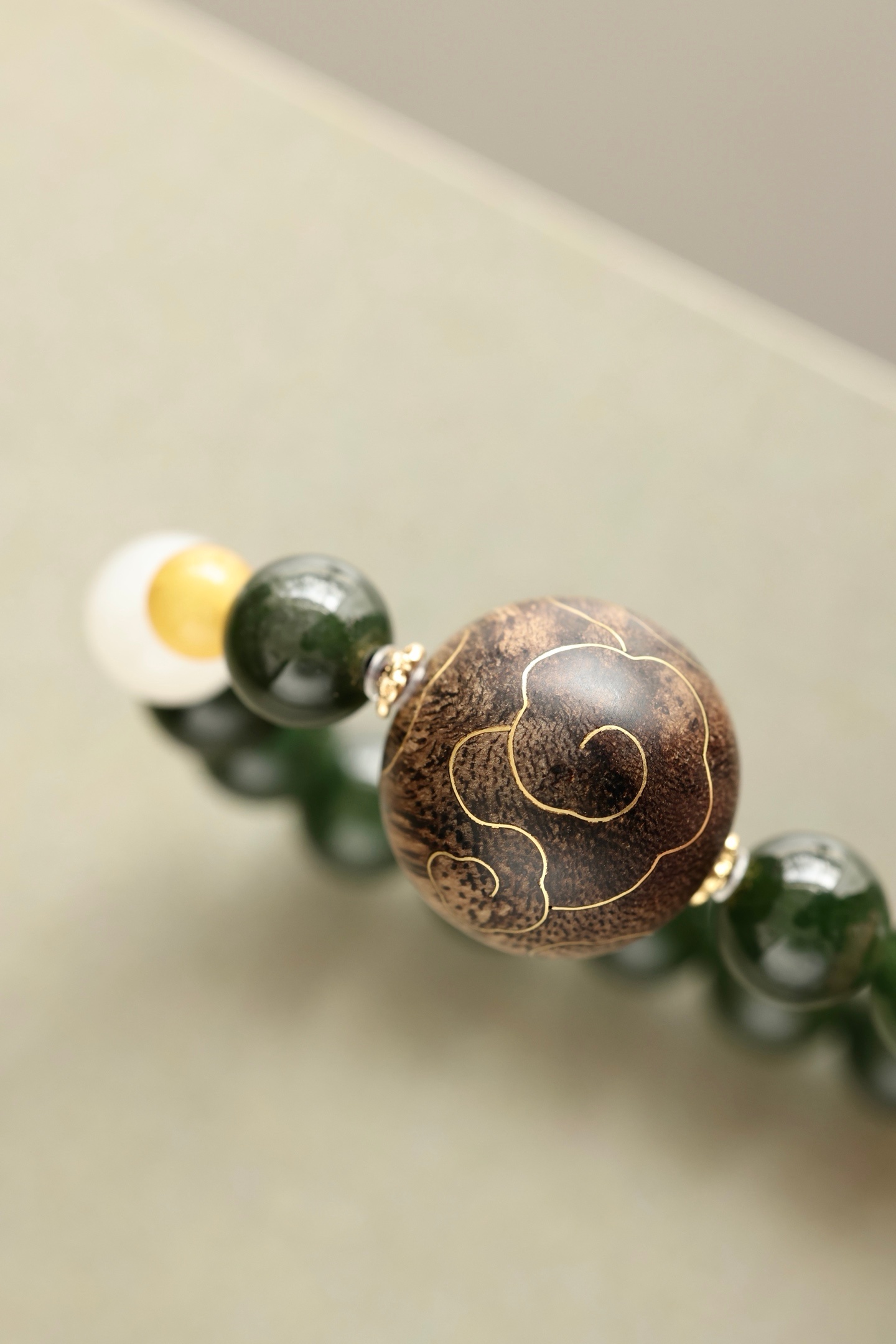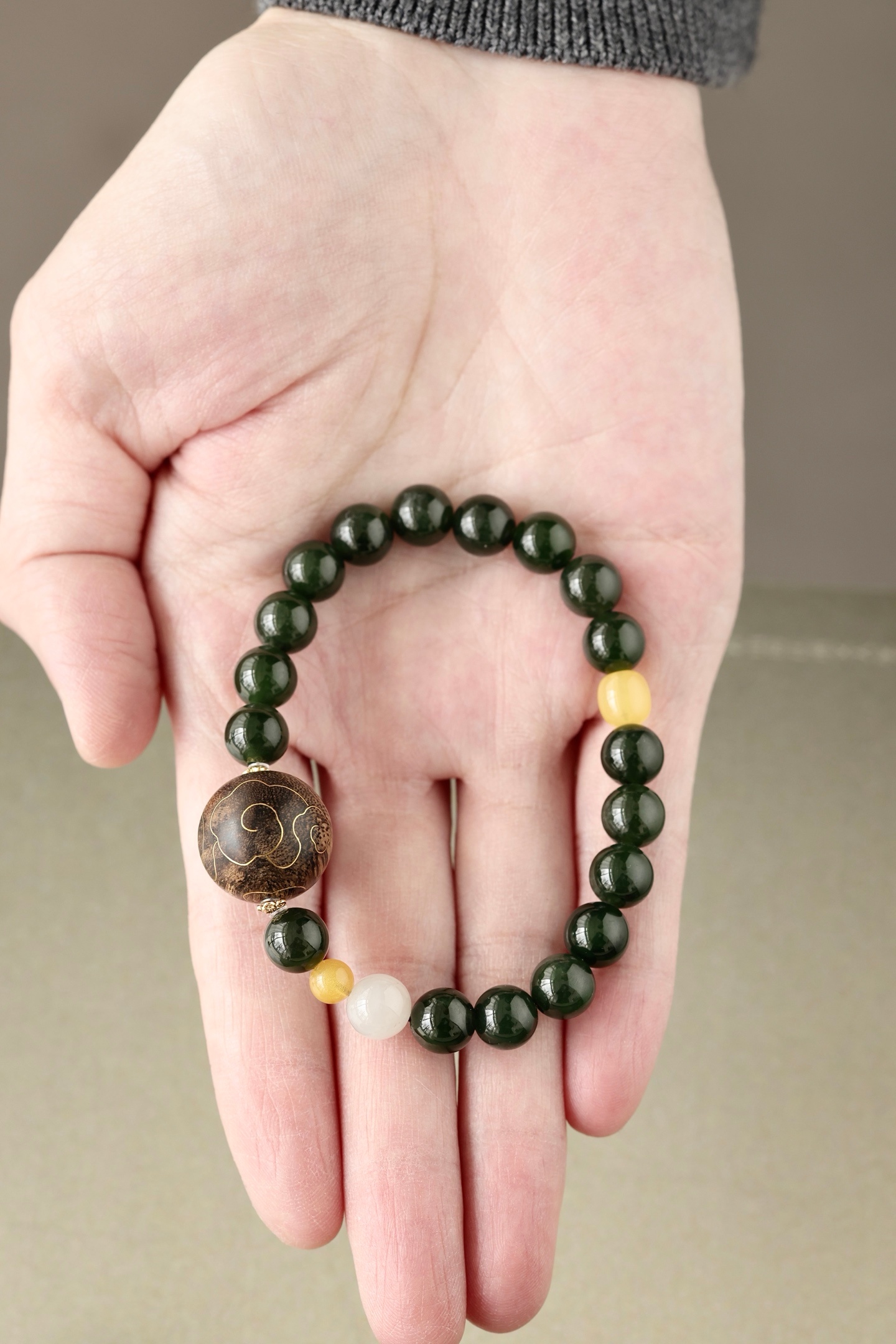 沉水17mm圆珠,油脂饱满,香气馥郁,周身祥云由古法错金工艺制作,气韵富贵,古雅端方,碧玉、蜜蜡、黄玉等配饰点缀其上,佩戴文气不失时尚之感。